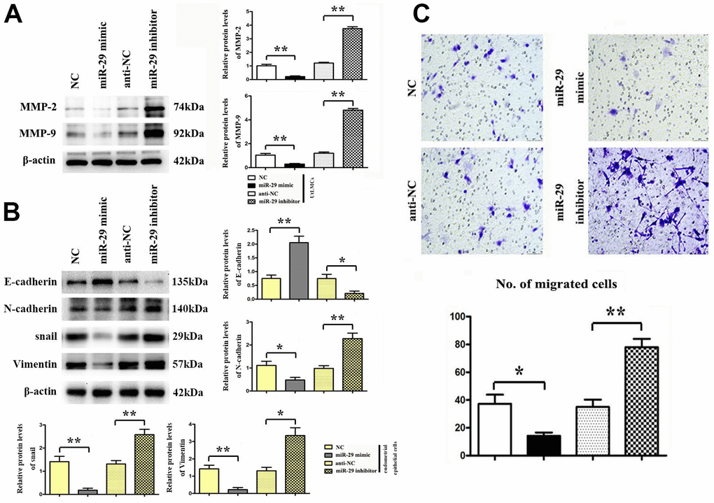The expression of MMP-2 and MMP-9 proteins in UtLMCs was confirmed by western blot. β-actin was used as a loading control. Results showed that miR-29 inhibited MMP-2 and MPP-9 in vitro compared with the NC control, and miR-29 inhibitors promoted the protein expression of MMP-2 and MMP-9 in vitro compared with the anti-NC control (P < 0.01, Figure 5A). Transwell migration assay showed that miR-29 suppressed cell migration in UtLMCs in vitro compared with the NC control (P < 0.05), and miR-29 inhibitors promoted cell migration in UtLMCs in vitro compared with the anti-NC control (P < 0.01, Figure 5B).