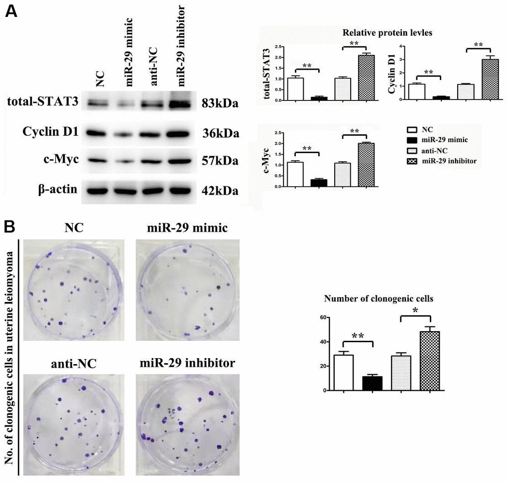 Whether miR-29 mimic affected the protein expression of STAT-3, Cyclin D1, and c-Myc was assessed by western blot. β-actin was used as a loading control. Results indicated that miR-29 mimics suppressed STAT-3, Cyclin D1, and c-Myc protein expression in vitro compared to the NC control, while miR-29 inhibitors boosted STAT-3, Cyclin D1, and c-Myc protein expression in vitro compared to the anti-NC control (P < 0.01, Figure 6A). Results demonstrated that miR-29 mimics inhibited cell proliferation in UtLMCs in vitro compared to the NC control (P < 0.01), while miR-29 inhibitors enhanced cell proliferation in UtLMCs in vitro compared to the anti-NC control (P < 0.05). (Figure 6B).