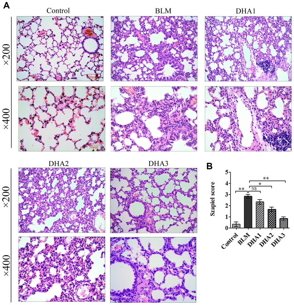 At 7 days after intratracheal bleomycin (BLM) administration, with or without DHA treatment, the rats were sacrificed by inhaling excess isoflurane (n = 6/group). Lung tissue samples were removed quickly and blood samples were collected for further analysis. Alveolar inflammation was induced on day 7 after intratracheal administration of BLM. As visualized by hematoxylin and eosin (H&E) staining (Figure 1A), the lung tissues from the control group of rats had intact alveoli, while the lung tissues from the rats stimulated with BLM exhibited obvious inflammatory cell infiltration in the alveolar cavity, pulmonary edema accompanying septal thickness, damage to the lung architecture, and alveolar disarray. DHA attenuated alveolar inflammation and reduced the septal edema and alveolar damage. Lung tissues from the DHA-3 group (100 mg/kg/d) exhibited some infiltration of inflammatory cells and slight pulmonary edema in comparison to those in the BLM group.