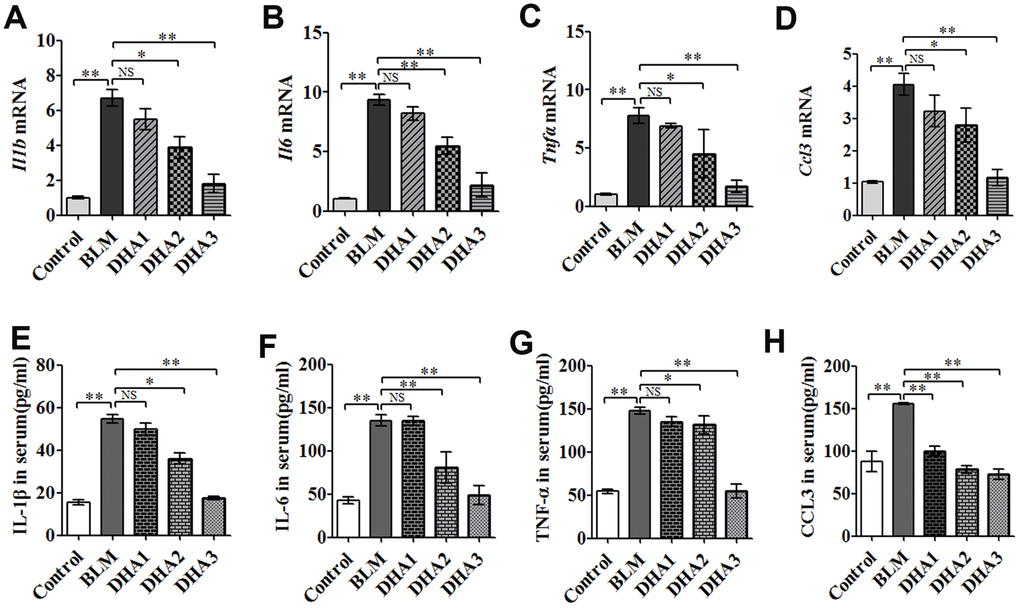 To reveal the role of DHA in the early inflammation of the BLM rat model, we used an enzyme-linked immunosorbent assay (ELISA) and quantitative real-time reverse transcription PCR (qRT-PCR) to detect inflammatory cytokines in the serum and lungs of rats at 7 days after modeling. The qRT-PCR result demonstrated that stimulation with BLM significantly increased the mRNA levels of interleukin (Il)-1B, Il6, tumor necrosis factor α (Tnfa), and chemokine (C-C Motif) Ligand 3 (Ccl3) in the rat lungs, while DHA attenuated these increases significantly (Figure 2A–2D) in a dose-dependent manner: A high dose of DHA3 inhibited the transcription of all the tested inflammatory cytokines in lung tissue effectively. Consistent with the qRT-PCR results, the protein levels of IL-1β, IL-6, TNFα, and CCL3 in the rat serum increased after BLM stimulation but decreased after DHA treatment (Figure 2E–2H). These results indicated that DHA attenuated the inflammatory response in the lungs and serum of BLM-exposed rats.