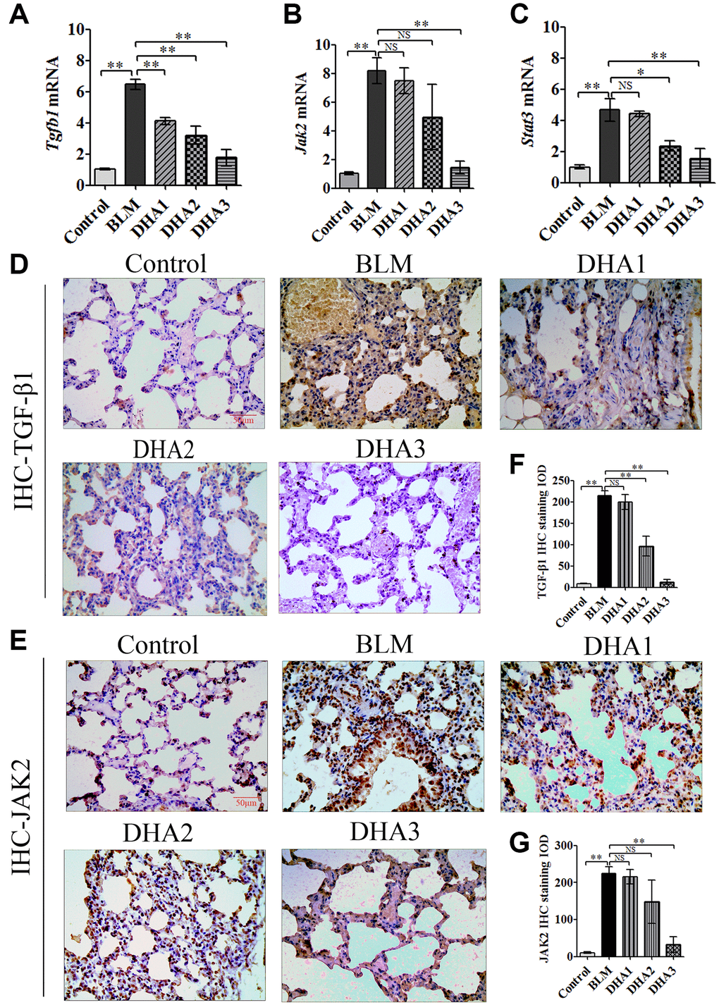The effect of DHA on JAK2 has been studied [39]; however, the present study further revealed that DHA inhibited STAT3 phosphorylation by inhibiting JAK2 phosphorylation. Regarding the mechanism by which DHA inhibits JAK2 phosphorylation, our study found that TGF-β1 expression and TNFα expression decreased significantly in lung tissues after treatment with DHA.