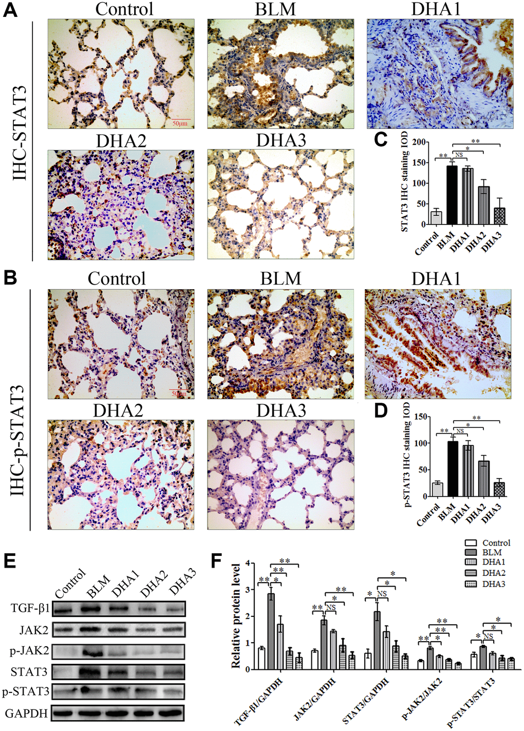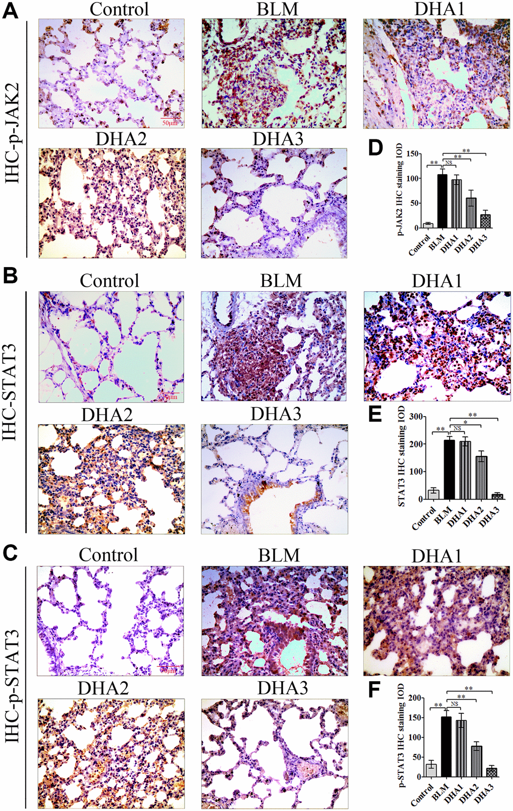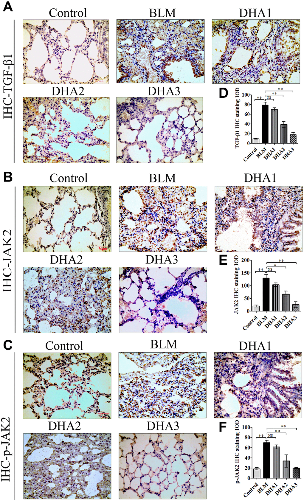 IHC was used to detect the levels of TGF-β1, JAK2, p-JAK2, STAT3, and p-STAT3 proteins in lung tissues (Figure 7A–7C, Figure 8A and 8B). According to the mean IOD score, DHA2 reduced the levels of TGF-β1, JAK2, p-JAK2, STAT3, and p-STAT3 significantly (Figure 7D–7F, Figure 8C and 8D).