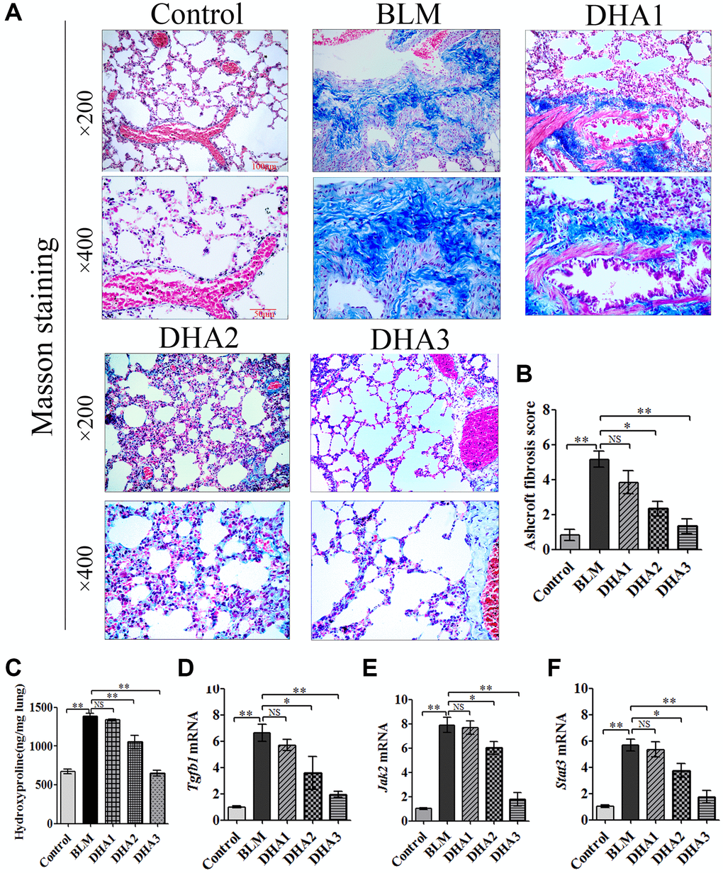 The Szapiel scoring method was used to assess the extent of pulmonary inflammation; the scoring rules are shown in Table 1. Three sections per specimen were stained and evaluated for Szapiel scoring, and two independent pathologists, who were blinded to the experiment, assessed the results. Compared with that of the control group, the Szapiel scores of BLM group increased significantly. Compared with that of the BLM group, the Szapiel score of the DHA-2 (50 mg/kg/d) group and DHA-3 group decreased significantly (Figure 1B). In the early stage of the PF model, BLM caused pneumonia, and DHA effectively inhibited pulmonary inflammation. In addition, DHA inhibited pulmonary inflammation in a dose-dependent manner, with intraperitoneal injection of a high dose of DHA3 inhibiting alveolar inflammation significantly.