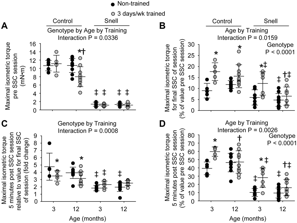 An additional factor to consider when interpreting the differences observed between Snell dwarf mice and control mice in the present study is that Snell dwarf mice undergo delayed or impaired maturation (e.g., reproductive immaturity) [5, 36]. Therefore, the Snell dwarf-specific results could have been due to processes associated with impaired maturation. Future work in which Snell dwarf are treated with hormonal supplementation for robust induction of puberty has the potential to address whether maturation state was a key factor in in regards to the outcomes of the present study [5]. Despite the various differences we observed between the Snell dwarf mice and control mice, they both shared the result of a muted improvement in post SSC isometric torque values at 12 months of age following 3 days per week training. This illustrates that although Snell dwarf mice appear to exhibit a better-preserved phenotype across age groups in general (relative to the maladaptation observed for control mice), Snell dwarf mice do not escape the consequences of such age-dependent alterations entirely.