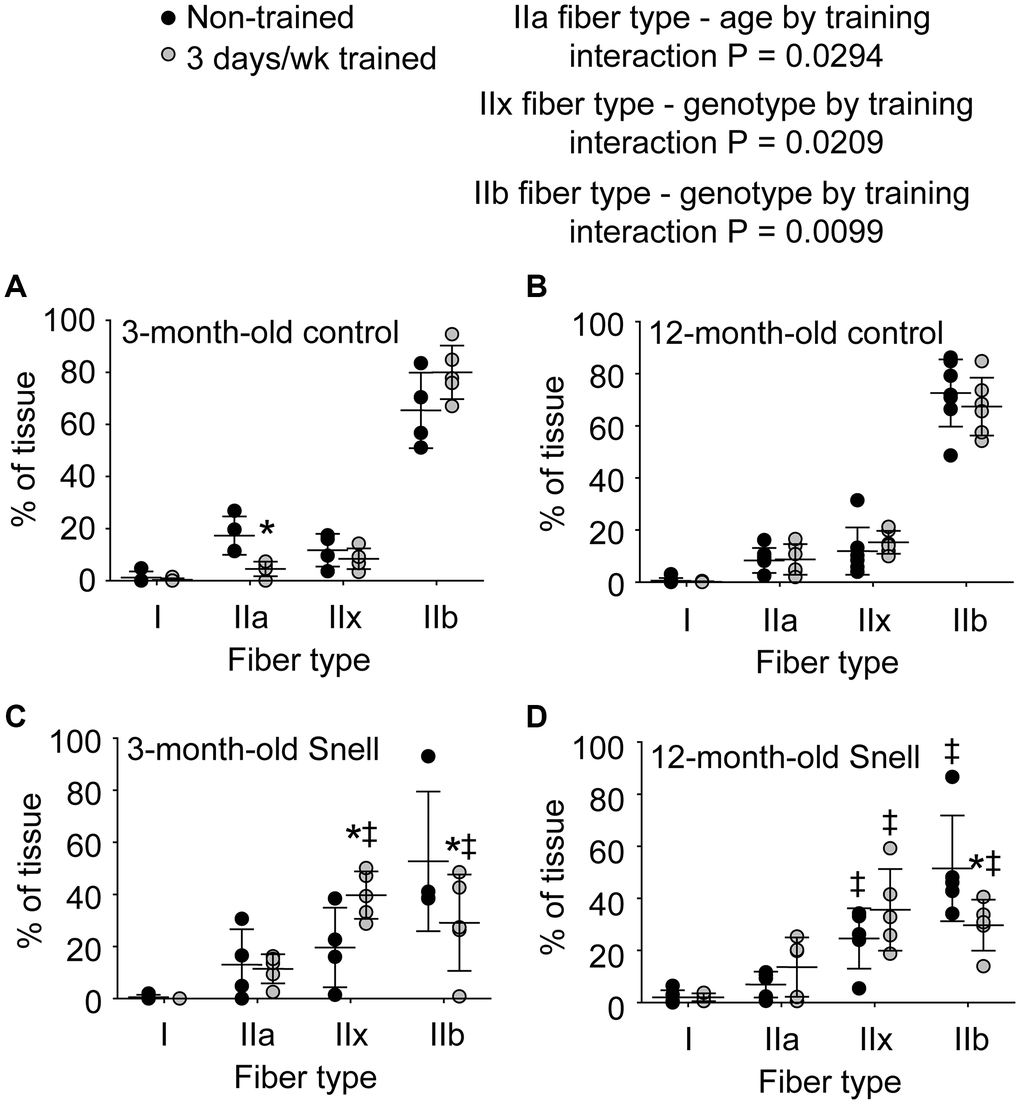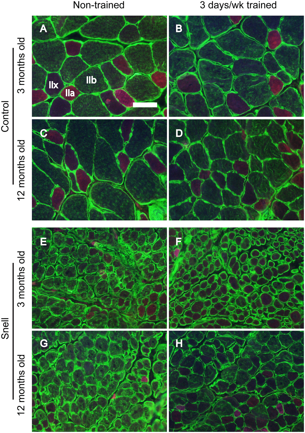 Training-induced muscle remodeling in the form of alterations in fiber type distribution and VCAM-1 protein levels was especially prevalent for Snell dwarf mice across age groups