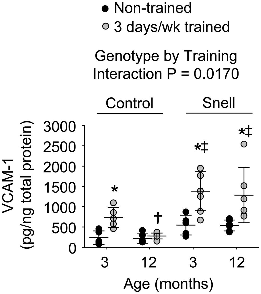 Immunofluorescence analysis was performed to determine the distribution of VCAM-1 in relation to capillaries as assessed by platelet endothelial cell adhesion molecule (CD31) localization (Supplementary Figure 3). ANOVA revealed that the main effects of age (P = 0.003) and genotype (P = 0.0008) impacted CD31+ node density (Supplementary Table 4). Relative to non-trained muscles of 3-month-old control mice, muscles of comparable Snell dwarf mice displayed 48% greater total CD31+ nodes per mm2 tissue (P = 0.0315). The factor of age was apparent between trained muscles of the different age groups of Snell dwarf mice with 32% higher CD31+ node density at 12 months of age versus 3 months of age (P = 0.0413). A more pronounced distribution of VCAM-1 within capillaries was indicated in Snell dwarf mice by the finding of a significant ANOVA main effect of genotype (P = 0.0273) regarding VCAM-1+/CD31+ nodes/mm2 (Supplementary Table 4). This was most apparent for muscles of trained 12-month-old Snell dwarf mice exhibiting a 3-fold greater value of VCAM-1+/CD31+ nodes/mm2 relative to values of age-matched trained control mice (P = 0.0117). No effect of training was observed for values of VCAM-1+/CD31+ nodes/mm2. Despite the lack of training effect on capillary localization of VCAM-1, protein levels of VCAM-1 were influenced by training (Figure 4). Training-induced VCAM-1 protein levels were the most extreme for Snell dwarf mice as indicated by a genotype by training interaction (P = 0.017) and the observation of training values 2-fold greater than those of control mice (Figure 4). Furthermore, training-induced increases in VCAM-1 protein levels persisted at 12 months of age exclusively for Snell dwarf mice (Figure 4).