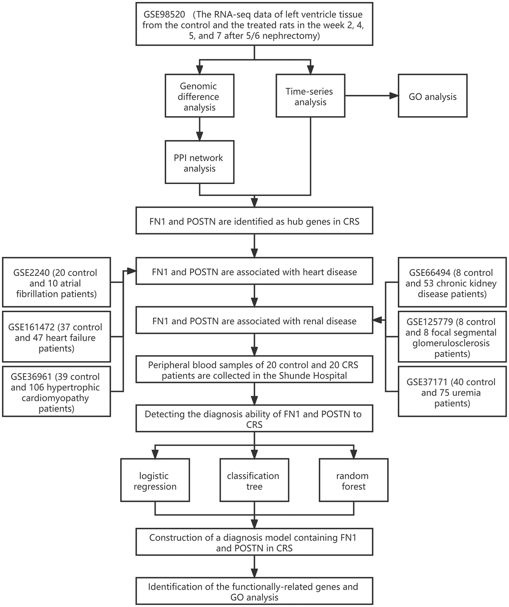 Herein, the transcriptome data of the rat ventricle tissue at weeks 2, 4, 5, and 7 after subtotal nephrectomy were retrieved from the Gene Expression Omnibus (GEO) database. Genomic divergence, protein–protein interaction (PPI) network, and time-series analyses were conducted to identify the hub genes involved in CRS progression. Transcriptome sequencing of different types of heart and renal diseases downloaded from the GEO database was used for preliminary verification. The peripheral blood of the control and CRS subjects was also collected from the Shunde Hospital of Southern Medical University, and real-time quantitative polymerase chain reaction (RT-qPCR) was performed to detect gene expression levels. Finally, multiple machine learning algorithms were used to improve the diagnostic ability based on these hub genes.