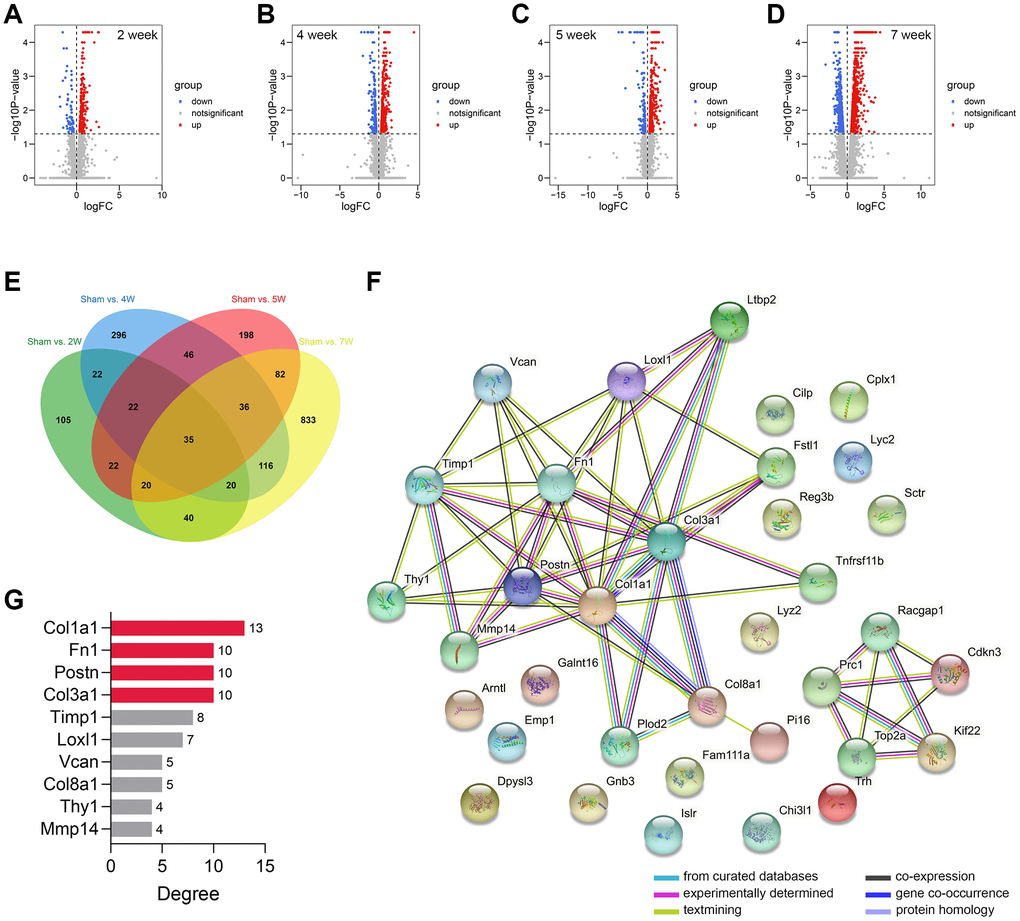 The workflow of the study protocol is shown in Figure 1. The R code used in this study is presented in Supplementary Material. The differentially expressed genes between the sham-operated and CRS model rats were analyzed. A total of 286 (Figure 2A), 593 (Figure 2B), 463 (Figure 2C), and 1182 (Figure 2D) genes showing expression differences were screened in 2-, 4-, 5-, and 7-week old rats, respectively, and 35 genes were found to overlap (Figure 2E). Subsequently, 35 genes were included in the PPI network (Figure 2F). The CytoHubba app revealed that the degrees of Col1a1, FN1, POSTN, and Col3a1 were greater than or equal to 10, and thus, the four genes were selected for subsequent analysis (Figure 2G, Supplementary Table 1).