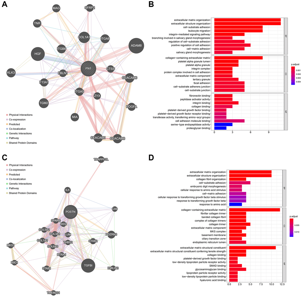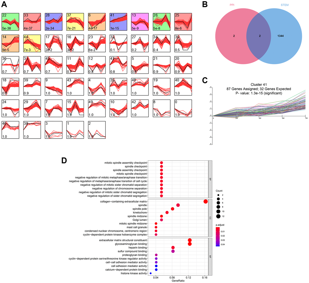 The time-series analysis of the transcriptome sequencing data of the CRS model rats at 4 time nodes identified 11 different gene clusters (P < 0.05) (Figure 3A). A total of 1346 genes were included in these clusters, of which fibronectin 1 (FN1) and periostin (POSTN) were determined by PPI network analysis (Figure 3B). Interestingly, FN1 and POSTN were both members of cluster 41 (P < 0.001, Figure 3C). GO enrichment analysis indicated that the genes in cluster 41 were mainly involved in cell cycle- and immune-related pathways, such as negative regulation of metaphase/anaphase transition of the cell cycle, spindle checkpoint, and mast cell granules (Figure 3D). The synthesis of pro-inflammatory mediators always increases in CRS, causing cell death and fibrosis [28]. In addition, cell cycle arrest plays essential roles in pathological processes as the renal and cardiac cells usually undergo cell cycle arrest to prevent possible DNA damage from cell division when the cells undergo cellular stress [29]. Generally, these findings correspond to those of previous studies.