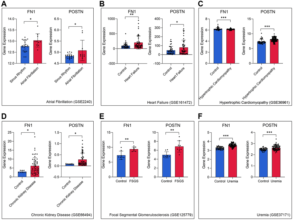 To further verify the role of FN1 and POSTN in CRS, transcriptome data of different heart and kidney diseases were downloaded. We found that FN1 was significantly upregulated in the atrial fibrillation (P < 0.05, Figure 4A), heart failure (P < 0.01, Figure 4B), hypertrophic cardiomyopathy (P < 0.001, Figure 4C), chronic kidney disease (P < 0.05, Figure 4D), focal segmental glomerulosclerosis (P < 0.01, Figure 4E), and uremia (P < 0.001, Figure 4F) samples compared with control samples. Similar trends were also observed in POSTN, as shown in Figure 4A–4F (P < 0.05). The indirect evidence partly demonstrated that FN1 and POSTN are strongly associated with many different heart and kidney diseases, thereby influencing the pathogenesis of CRS.