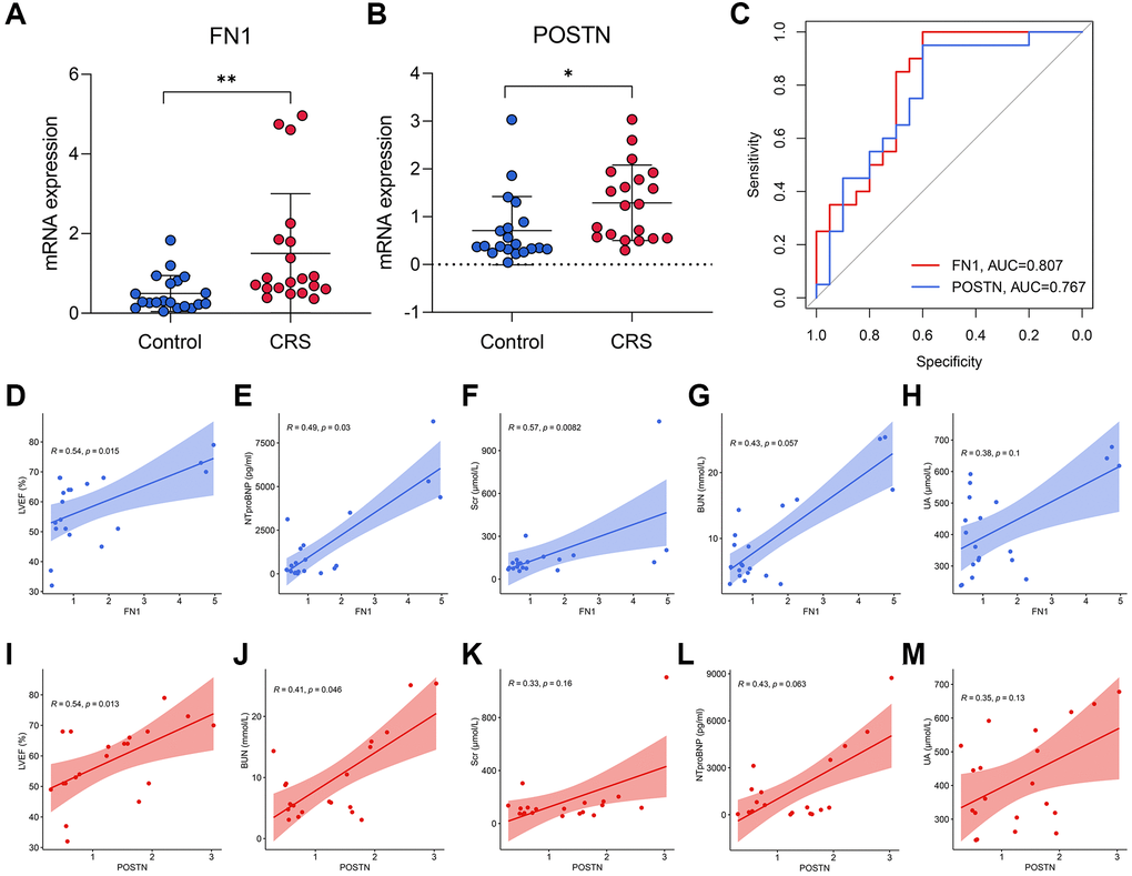 RT-qPCR was used to measure the expression levels of FN1 and POSTN in the peripheral blood of control and CRS patients. The original CT values of FN1, POSTN, and GAPDH are listed in Supplementary Table 2. The baseline clinicopathological information of the subjects enrolled in this study is displayed in Table 3. Except for smoking history (P < 0.05), Scr (P < 0.05), BUN (P < 0.01), and UA (P < 0.01), other parameters, including age, sex, diabetes history, LVEF, and NT-proBNP, revealed no significant differences between the control and CRS groups. Compared with the control subjects, the CRS cases exhibited higher expression levels of FN1 (P < 0.01, Figure 5A) and POSTN (P < 0.05, Figure 5B). ROC analysis indicated that FN1 (AUC = 0.807, Figure 5C) and POSTN (AUC = 0.767, Figure 5C) were both diagnostic biomarkers with high efficacy. The association of the expression values of FN1 and POSTN with routine laboratory tests was also detected. FN1 was significantly associated with LVEF (R = 0.54, P < 0.05, Figure 5D), NT-proBNP (R = 0.49, P < 0.05, Figure 5E), and Scr (R = 0.57, P < 0.01, Figure 5F), but no significant association was observed with BUN (R = 0.43, P = 0.057, Figure 5G) or UA (R = 0.38, P = 0.1, Figure 5H). POSTN was further significantly correlated with LVEF (R = 0.54, P < 0.05, Figure 5I) and BUN (R = 0.41, P < 0.05, Figure 5J), while no significant association was observed between POSTN and Scr (R = 0.33, P = 0.16, Figure 5K), NT-proBNP (R = 0.43, P = 0.063, Figure 5L), and UA (R = 0.35, P = 0.13, Figure 5M). The association of CRS with LVEF [30], NTproBNP [31], Scr [32], and BUN [33] has been verified in multiple studies, which strengthens the reliability of FN1 and POSTN.