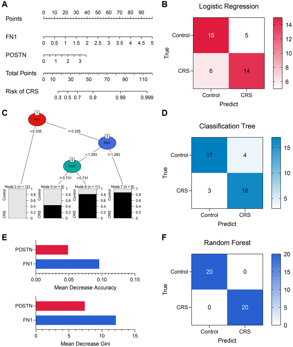 Diagnostic models containing FN1 and POSTN were established using multiple machine learning algorithms. The logistic regression model was constructed as follows: logistic score = −2.10 + 1.58*EXP(FN1) + 0.88*EXP(POSTN), where EXP represented the mRNA expression level of FN1 or POSTN. A nomogram including FN1 and POSTN was constructed to help clinicians better understand the logistic model (Figure 6A). The confusing matrix of indicated that the logistic regression model could predict CRS with high efficacy (Figure 6B). The classification tree is shown in Figure 6C. Compared with the logistic regression model, the classification tree showed a higher predictive ability (Figure 6D). Unexpectedly, it was found that only FN1 was included in the classification tree model, implying that FN1 had better predictive ability than POSTN. In the random forest model, the importance of FN1 and POSTN was quantified as a mean decrease in accuracy and Gini, which were previously described [34]. Compared with POSTN, FN1 exhibited higher mean decreases in accuracy and Gini (Figure 6E), which was in agreement with the classification tree analysis. The random forest model could distinguish the CRS sample with the highest effectiveness (Figure 6F, Supplementary Figure 1A and 1B), which is in alignment with the results of several previous studies that have provided proof of its strong performance [35–37]. The accuracy, precision, recall, and F-score of each model are listed in Table 4. In addition, the predictive ability of CRS for clinicopathological features and established diagnostic models were also compared (Supplementary Figure 1A and 1B). Overall, compared with the traditional biomarkers or single biomarkers like FN1 and POSTN, the combination of FN1 and POSTN through machine learning algorithms, especially random forest, greatly improved the efficiency of CRS diagnosis.