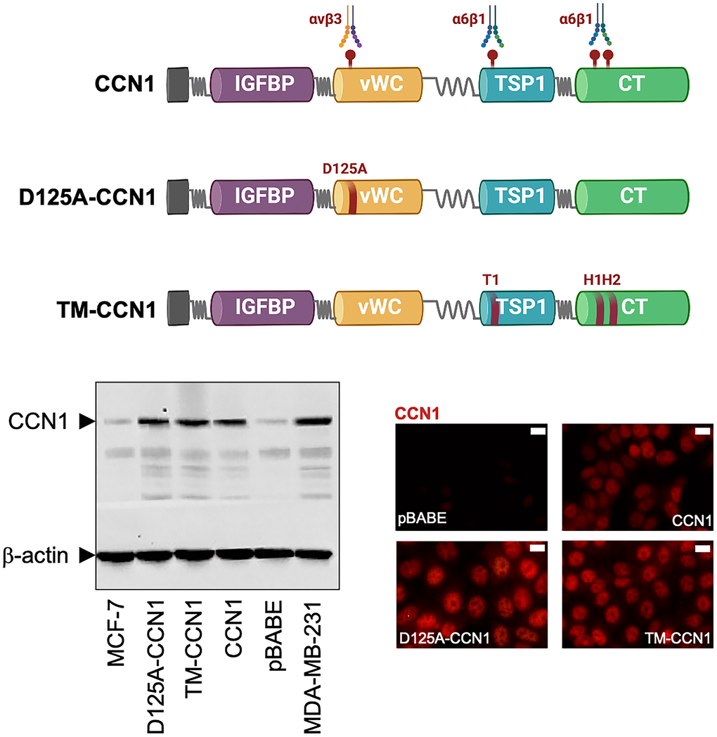 Estrogen-dependent MCF-7 breast cancer cells, which naturally express very low levels of CCN1, were engineered to stably overexpress either wild-type CCN1 or the mutational derivatives D125A-CCN1, which exhibits a disrupted αvβ3-binding site through the D125A mutation, and TM-CCN1, which abrogates all the T1, H1, and H2 binding sites to α6β1 (Figure 1) [25–28]. Immunoblotting procedures, which were performed following cell starvation to prevent the serum effect on CCN1 expression, confirmed that CCN1 was almost undetectable in MCF-7 parental and MCF-7/pBABE control cells but was noticeably elevated in MCF-7/CCN1, MCF-7/D125A-CCN1, and MCF-7/TM-CCN1 cells (Figure 1). CCN1 protein levels in MCF-7/CCN1, MCF-7/D125A-CCN1, and MCF-7/TM-CCN1 cells were comparable to those of MDA-MB-231 cells, a triple-negative breast cancer model naturally overexpressing CCN1 [15, 16]. Immunofluorescence analysis of CCN1 protein revealed that, in addition to its cytoplasmic location, CCN1 exhibited an apparent nuclear-staining pattern in the majority of MCF-7 breast cancer cell lines, with no evident differences between wild-type and mutant CCN1 (Figure 1).