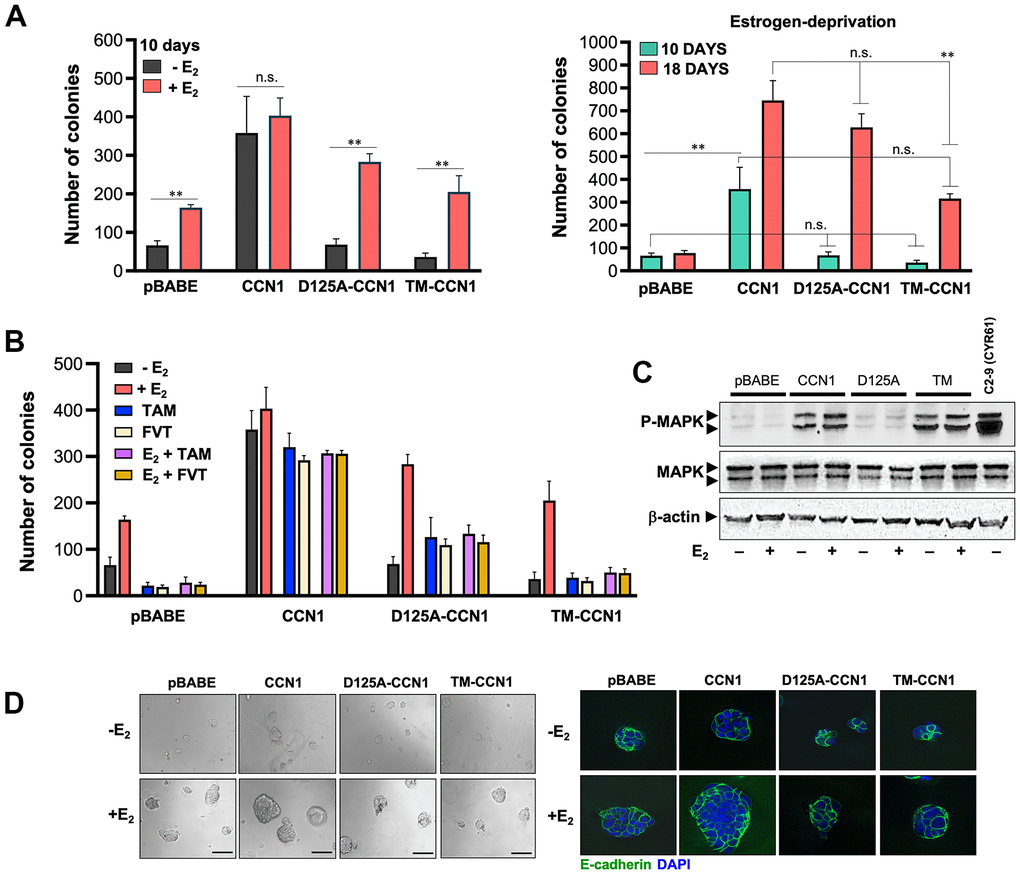 We then re-assessed the patterns of anchorage-independent growth in the long-term absence of estrogens (up to 18 days in soft-agar). MCF-7/D125A-CCN1 cells were capable of strikingly circumvent estradiol requirement to form a similar number of colonies to those generated by MCF-7/CCN1 cells in the long-term (Figure 2A, right panel). The ability of D125A-CCN1 to drive long-term acquisition of an estrogen-independent phenotype was much less pronounced with the TM-CCN1 derivative. Thus, although capable of forming colonies after long term culture in the absence of estradiol, MCF-7/TM-CCN1 cells failed to fully recapitulate the highly-aggressive, estrogen-independent phenotype of MCF-7/CCN1 and MCF-7/D125A-CCN1 cells (Figure 2A, right panel).