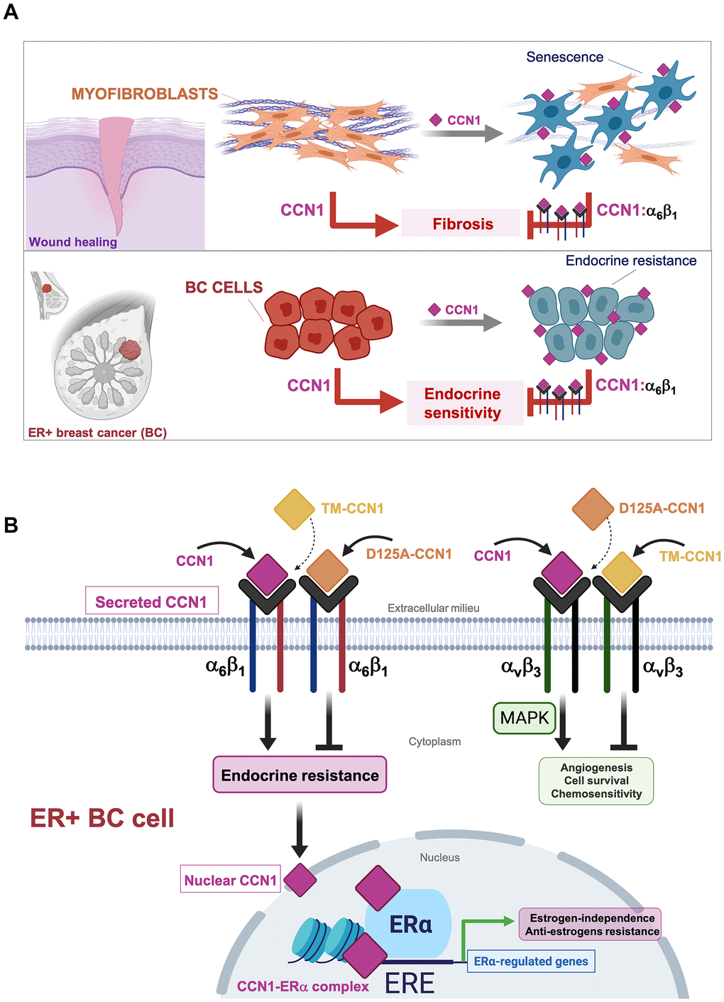 CCN1/CYR61 might promote enhanced angiogenesis and deregulated proliferation and chemoresistance in breast tumors by binding to and activating αvβ3 integrin signaling. CCN1/CYR61 promotes resolution of tissue fibrosis through induction of cellular senescence in myofibroblasts by engaging integrin α6β1 [11–13, 23]. Our present description of a novel role for the angiogenic/senescence inducer CCN1 in driving antiestrogen-resistance via α6β1 might provide a starting point to accelerate the development of CCN1/α6β1 integrin antagonists to therapeutically prevent the emergence of endocrine resistant phenotypes in ER-positive breast carcinomas.