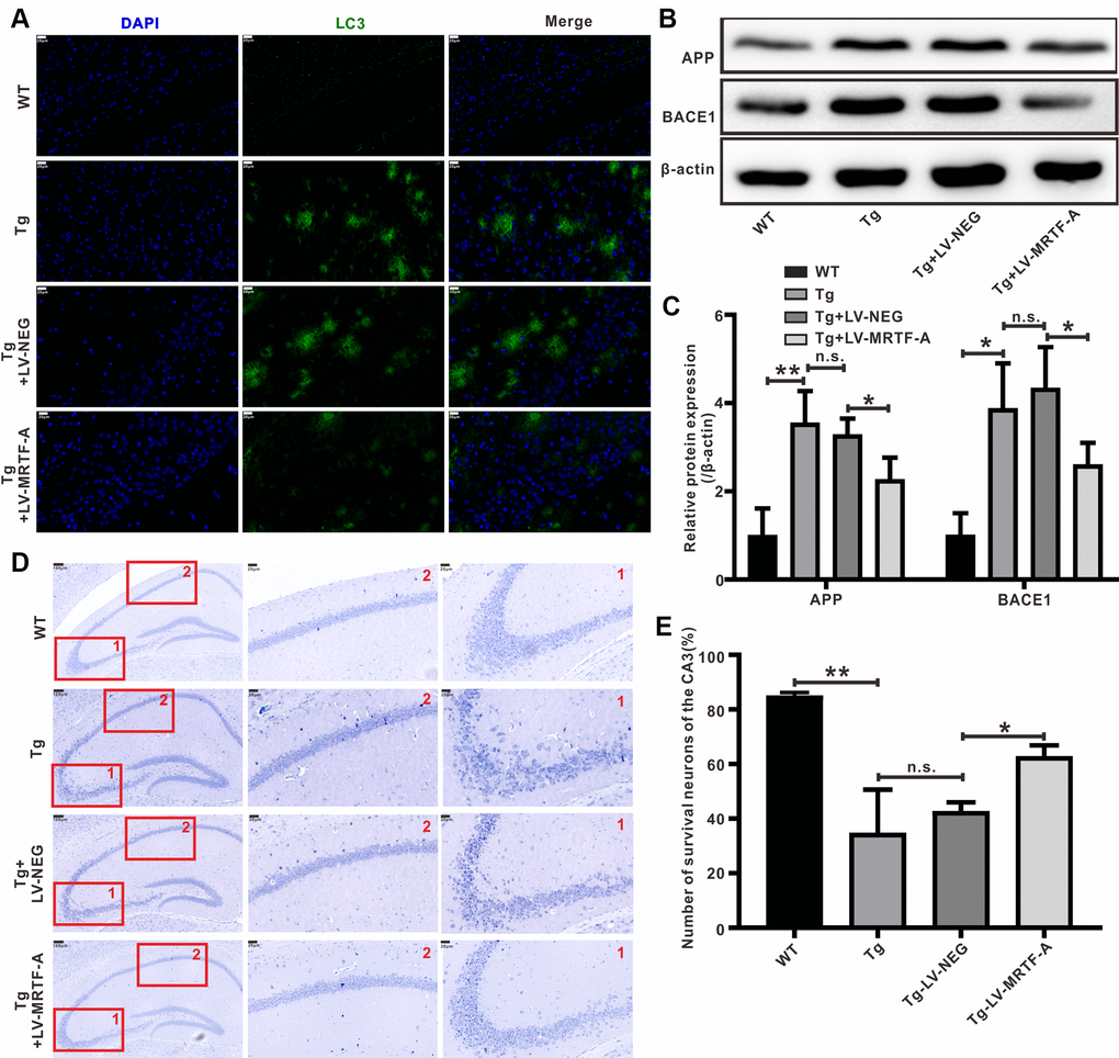 In the present study, we investigated the effects and the underlying mechanism of MRTF-A on Aβ-induced neurotoxicity and autophagy dysfunction in vivo and in vitro Alzheimer models. Our current research shows that there is a decreasing of MRTF-A protein in the hippocampus of Tg2576 mice, which is related to its learning and memory impairment. Overexpression of MRTF-A improved memory impairment and cognitive function in Tg2576 AD mouse model.