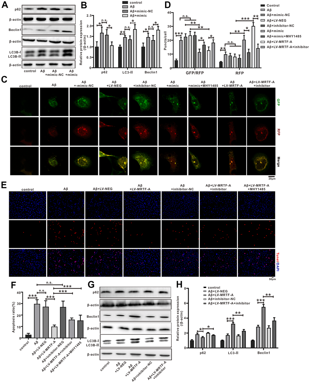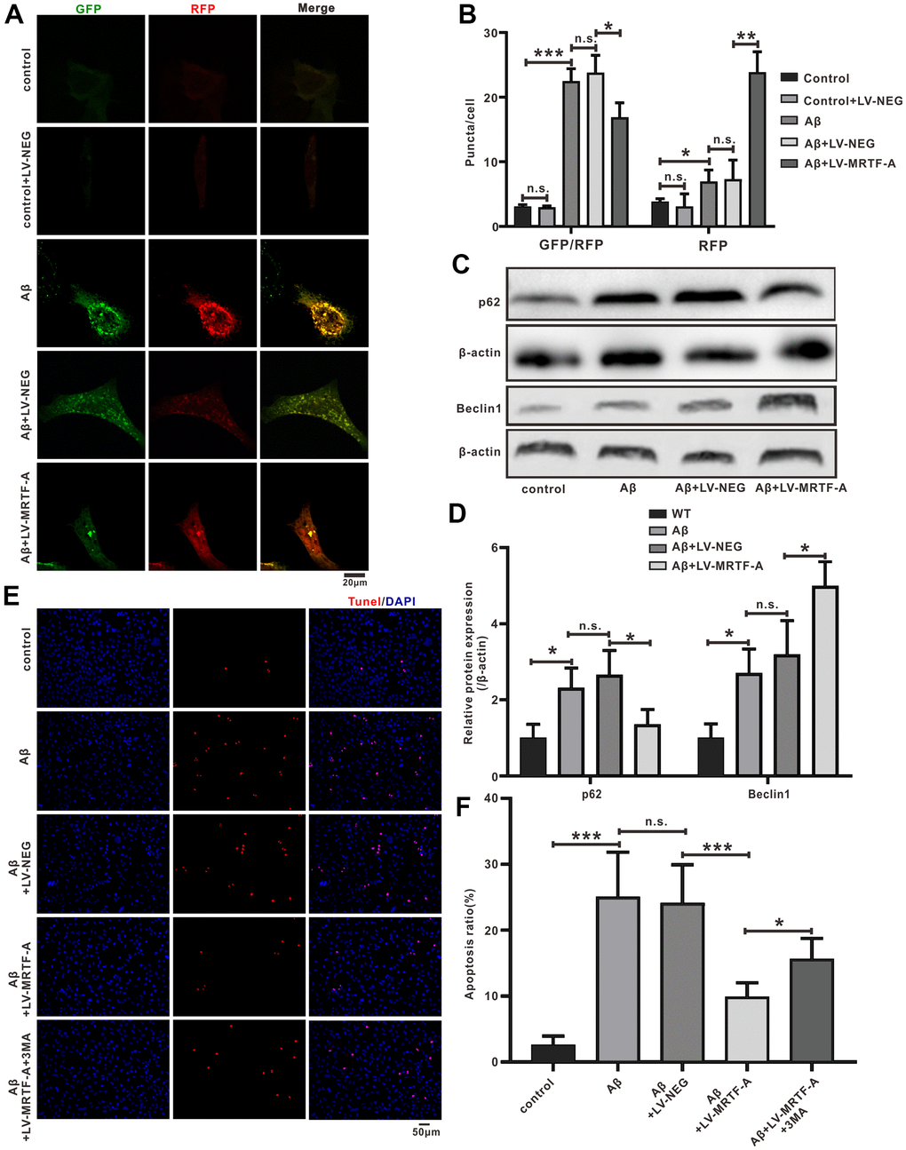 In order to further confirm whether the regulation of autophagy by MRTF-A is responsible for its inhibition of neuronal apoptosis, the cells were incubated with 3-MA (Class III PI3K inhibitor) as an autophagy inhibitor. Then cell apoptosis rates were detected by TUNEL labeling. Compared with the control group, the number of apoptotic neurons in the Aβ or Aβ+LV-NEG group was significantly increased. However, compared with the Aβ+LV-NEG group, the amount of apoptosis in the Aβ+LV-MRTF-A group was significantly reduced. Further, its inhibitory effect was significantly eliminated by co-incubation with 3-MA (Figure 4E, 4F). These results indicate that the inhibition of Aβ-induced neuronal damage by MRTF-A is related to the rescue of autophagy damage.