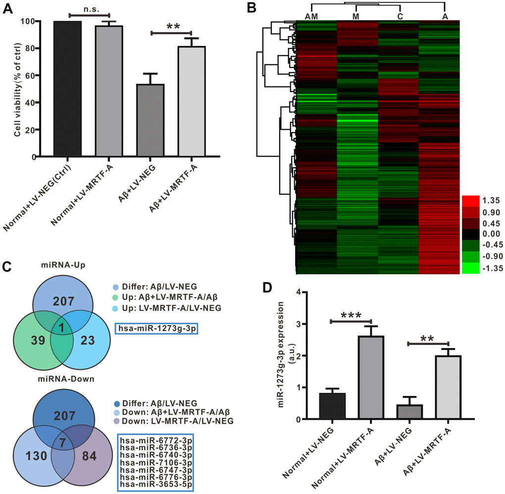 To test the mechanism of MRTF-A on autophagy, transfection of Aβ-treated SH-SY5Y cells with LV-MRTF-A or its negative carrier were subjected to miRNA microarray analysis, and normal was as control. As shown in Figure 5A, compared with Aβ1-42 treatment group, transfection of LV-MRTF-A increased cell viability (Figure 5A). The microarray data that there were 207 differential expressed miRNAs (DEMs). Next, the DEMs underwent Venn analysis (Figure 5B, 5C). A total of 8 significantly DEMs were determined, including one up-regulated and seven down-regulated. To confirm the regulatory effect of MRTF-A on miR-1273g-3p, Aβ-treated SH-SY5Y cells were transfected with LV-MRTF-A. As shown in Figure 5D, LV-MRTF-A significantly increased miR-1273g-3p level (≥ 4.2 times) in normal or Aβ-treated SH-SY5Y cells (Figure 5D).