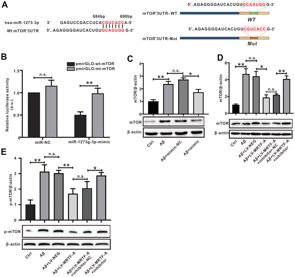 This study was to investigate the effect of MRTF-A on Aβ-induced neurotoxicity in the models of Tg2576 AD mouse and Aβ1-42-treated SH-SY5Y cell. According to the hypothesis of MRTF-A regulating miR-1273g-3p/mTOR axis, we further investigated the mechanism of MRTF-A based on bioinformatics analysis and experimental verification. Our results might provide new avenues for therapeutic approaches of AD.