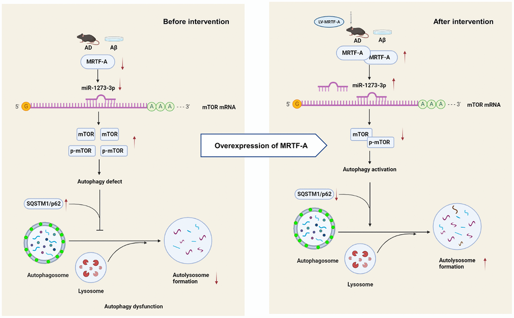 Our study shows that MRTF-A improves cognitive deficit of Alzheimer mice and alleviated Aβ-induced neurotoxicity in vivo and in vitro. Further, MRTF-A rescues the Aβ-induced autophagy impairment via regulating miR-1273g-3p/mTOR axis, which maybe contributes to the protective effect of MRTF-A against Aβ-induced neurotoxicity. Therefore, upregulation of MRTF-A or activation of miR-1273g-3p/mTOR axis may serve as a potential therapeutic target in AD treatment. (Summarized in Figure 8).