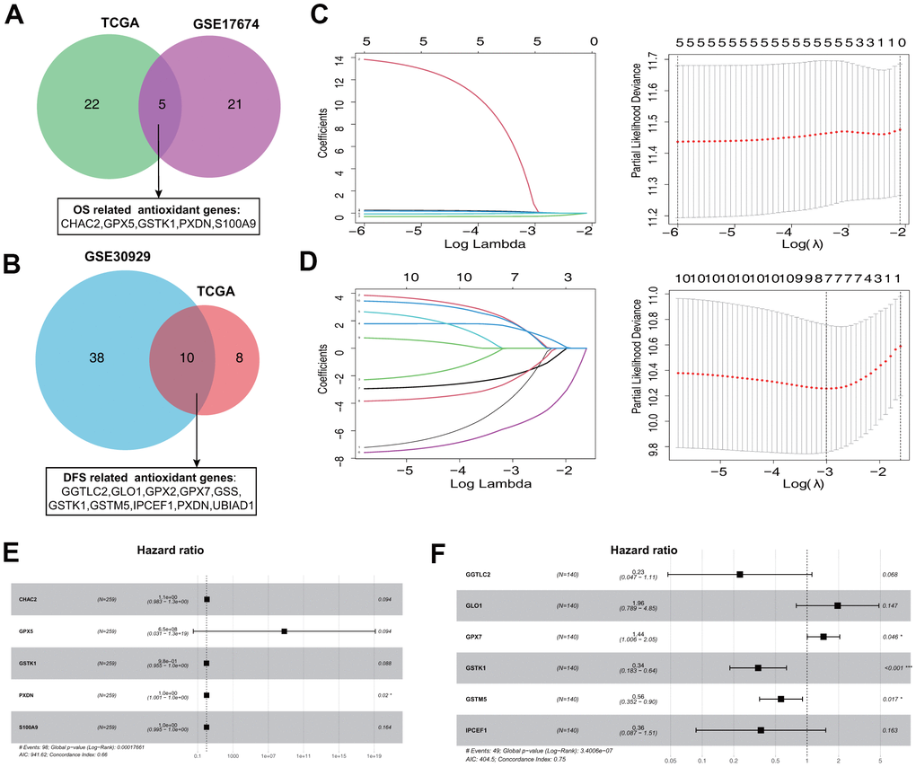 The five OS-related and 10 DFS-related antioxidant genes were subjected to tenfold cross-validated LASSO regression to generate the best gene model. The LASSO coefficients were plotted against the log(k) values, and five OS-related genes and seven DFS-related genes were selected (Figure 1C, 1D). On the basis of multivariate Cox regression analysis results, five genes (CHAC2, GPX5, GSTK1, PXDN, and S100A9) associated with OS and six genes (GGTLC2, GLO1, GPX7, GSTK1, GSTM5, and IPCEF1) associated with DFS were selected for establishing risk signatures (Figure 1E, 1F). The prognostic risk score formula was specifically constructed by the multivariate Cox regression analyses (Tables 1, 2).