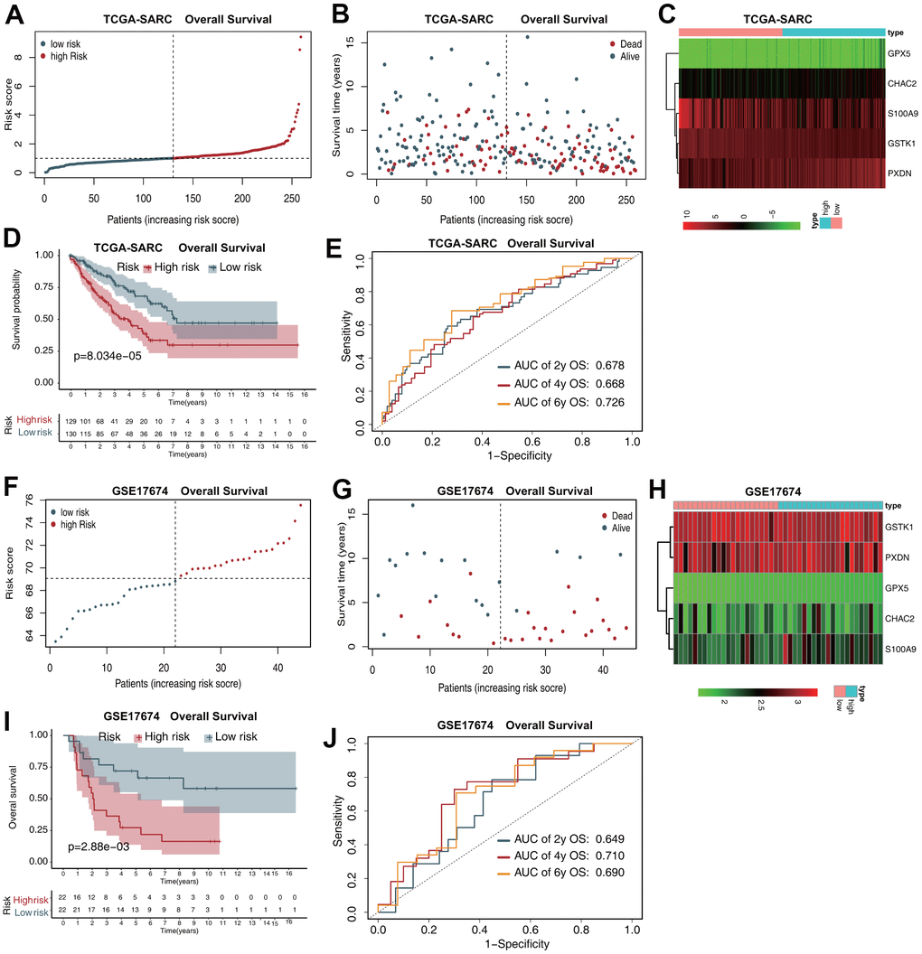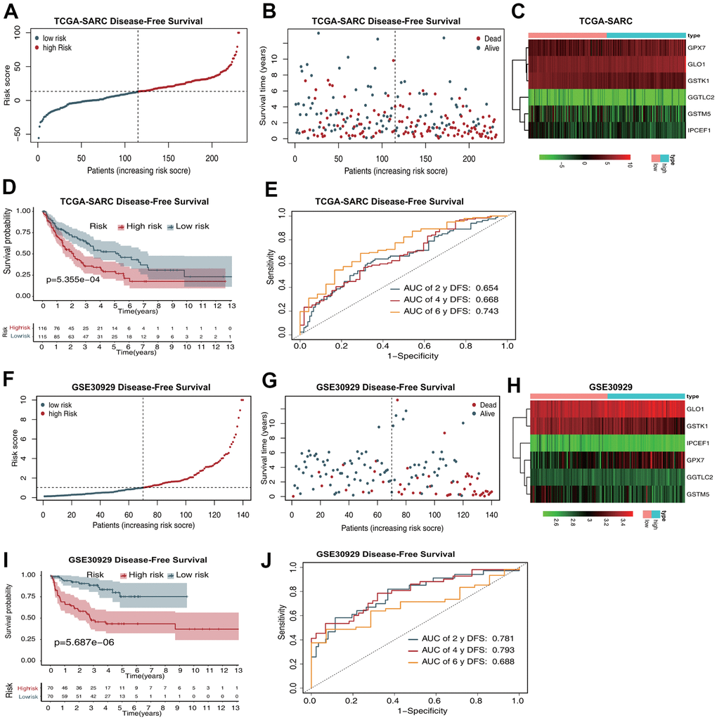 Based on the established OS and DFS risk signatures, the risk score for each patient with sarcoma was calculated. The median score was set as the cutoff value for categorizing sarcoma patients into low- (≤ median score) and high-risk (> median score) groups.