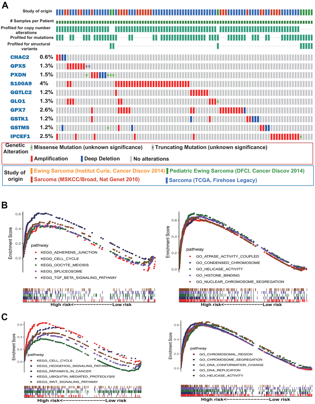 Gene mutation analysis of the 10 antioxidant genes included in the OS and DFS signatures showed that S100A9, GPX7, IPCEF1, PXDN, and GPX5 were the most frequently mutated genes. Notably, amplification was the most common type of mutation, and S100A9, IPCEF1, and GPX7 were frequently amplified in sarcoma (Figure 4A). Subsequently, we performed GSEA based on Gene Ontology (GO) functional annotation and Kyoto Encyclopedia of Genes and Genomes (KEGG) pathway annotation in the low- and high-risk groups. The top five GO terms and KEGG pathways that were significantly enriched in the high-risk group are shown in Figure 4B, 4C.