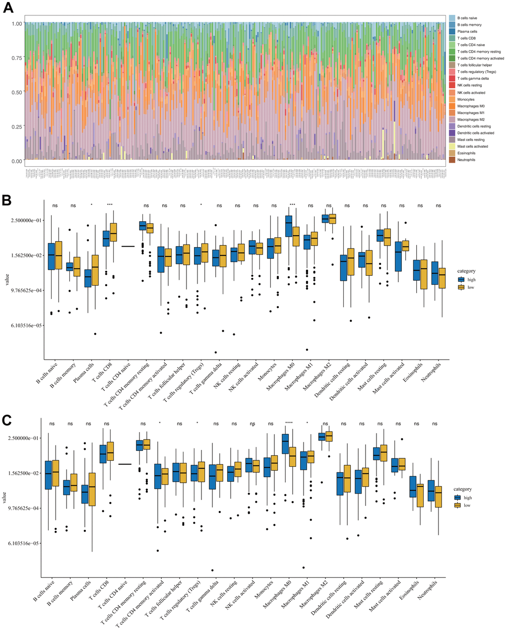 CIBERSORT was used to compare the level of infiltration of 22 immune cell types between the low- and high-risk groups in the TCGA-SARC samples. Figure 5A shows the tumor-infiltrating immune cell composition in each sample. Among the 22 immune cell types, the levels of infiltration of plasma cells, non-activated macrophages (M0), and cytotoxic CD8+ T cells were significantly different between the OS low- and high-risk groups (Figure 5B). For DFS, the levels of infiltration of memory CD4+ T cells and M0 and proinflammatory (M1) macrophages were significantly different between the two groups (Figure 5C).
