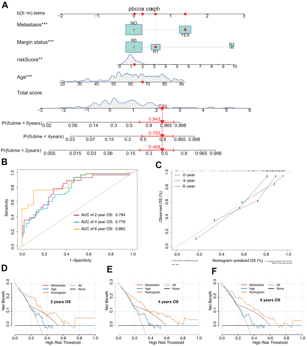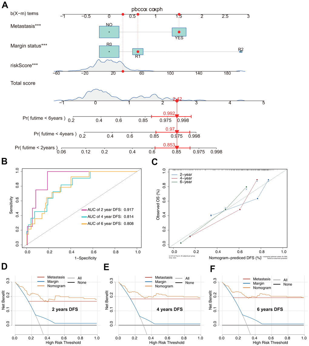 To improve the accuracy of the prediction model, we established nomograms based on the risk scores and other independent risk factors, and these models showed good calibration and discrimination. DCA indicated that the nomograms showed higher clinical benefit and utility than simple clinical features. In addition, the AUCs for 2-, 4-, and 6-year OS prediction were 0.794, 0.779, and 0.862 for OS and 0.917, 0.814, and 0.808 for DFS, respectively. More importantly, to facilitate clinical application, we established two web-based tools to provide free services for OS and DFS prediction.