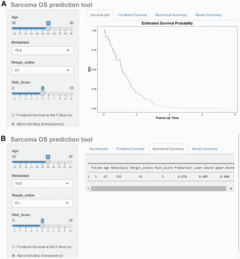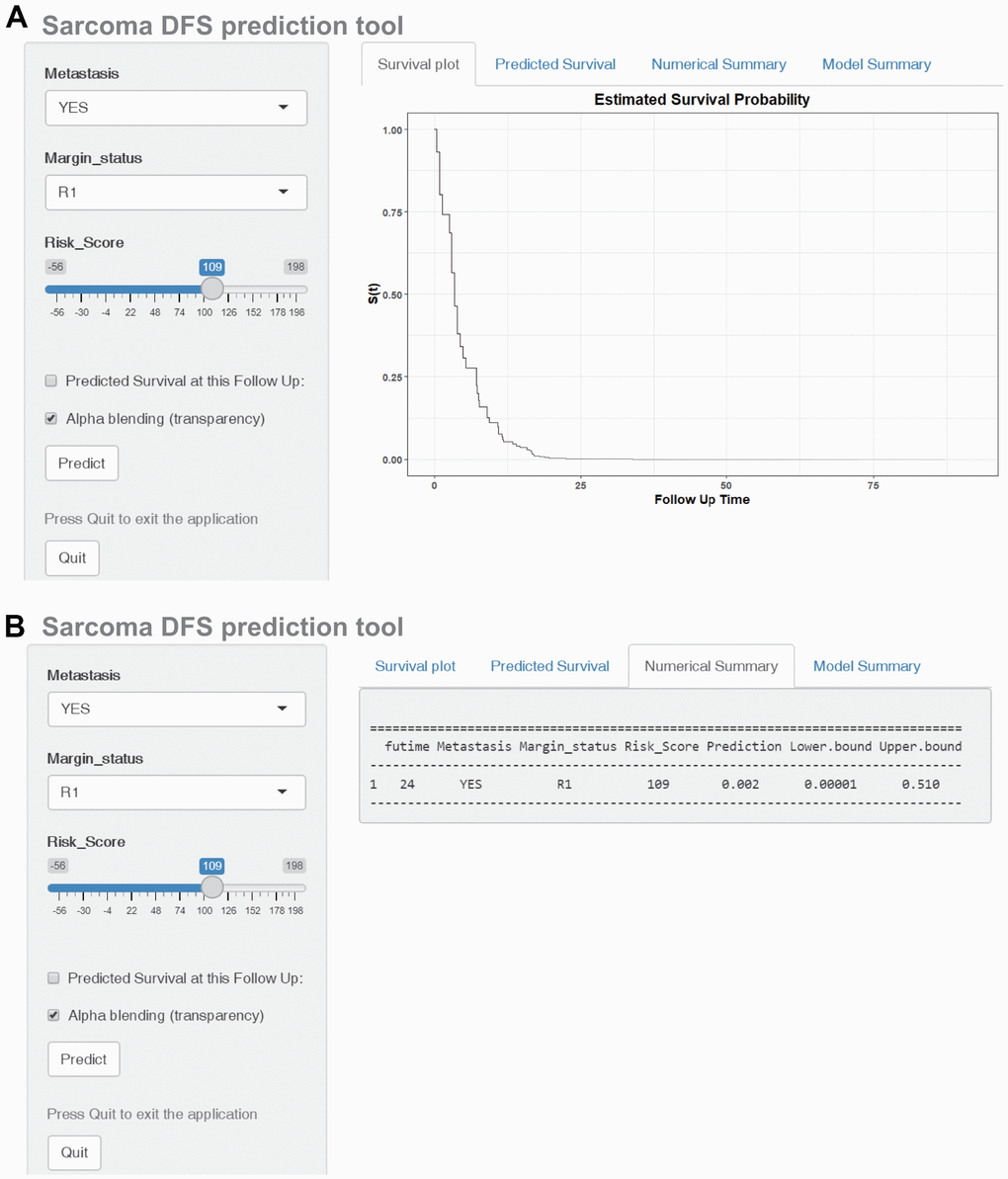 The DFS nomogram that integrated the three independent factors is shown in Figure 8A. ROC analysis, a calibration plot, and DCA were used to evaluate the nomogram. The AUCs of 2-, 4-, and 6-year DFS prediction were 0.917, 0.814, and 0.808, respectively (Figure 8B). A calibration plot showed excellent calibration of the nomogram (Figure 8C). The results of DCA of the DFS nomogram and other clinical features are presented in Figure 6D–6F. A web-based tool (https://quankun.shinyapps.io/sarcDFS/) was established for predicting the DFS of sarcoma patients (Figure 9A, 9B).