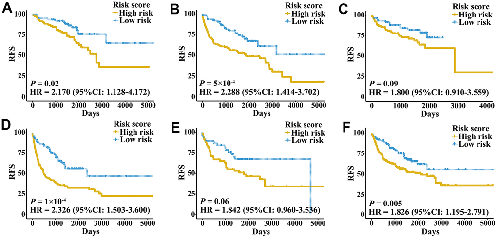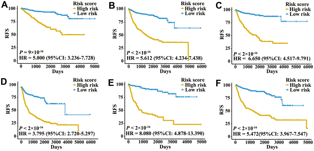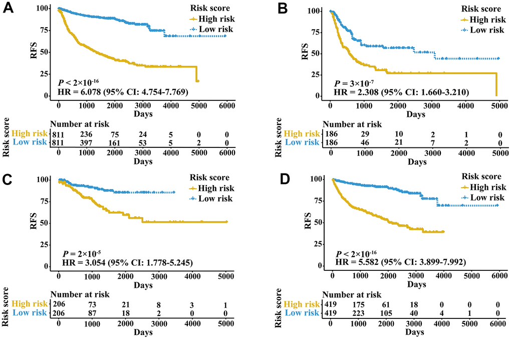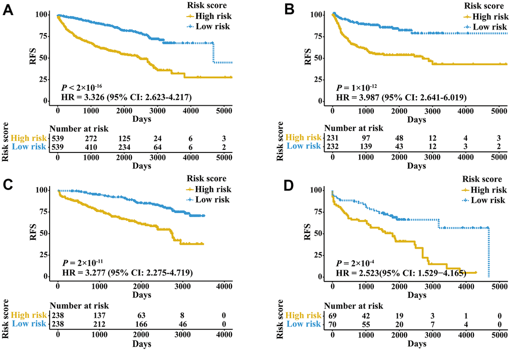 External validation cohorts were used to confirm the ability of the IRGPI to predict RFS of patients with three urologic cancers in different populations. The same IRGPs were used to calculate the IRGPI, and the patients were also classified into low- and high-risk groups. RFS of patients in low and high IRGPI groups were significantly different in the meta-validation cohort (Figure 3A, HR 3.326, 95% CI 2.623-4.217; P < 2×10-16), validation dataset of bladder cancer (Figure 3B, HR 3.987, 95% CI 2.641-6.019; P = 1×10-12), validation dataset of prostate cancer (Figure 3C, HR 3.277, 95% CI 2.275-4.719; P = 2×10-11), and validation dataset of kidney cancer (Figure 3D, HR 2.523, 95% CI 1.529-4.165; P = 2×10-4). Time-ROC curves showed stable predictive abilities, with 1-, 3-, 5-, and 10-year AUCs of 0.794, 0.764, 0.739, and 0.605, respectively (Supplementary Figure 2C). Similarly, the patients with high IRGPI and advanced tumor stage had the highest RFS among patients in the meta-validation cohort (Supplementary Figure 2D). Consistent with the training cohorts, the IRGPI was able to divide patients into significantly different groups in terms of RFS in mostly independent validation cohorts (Supplementary Figure 3). When considering patients with early- or late-stage disease, male patients and patients older than 60 years, the IRGPI remained highly prognostic, and a higher IRGPI score was associated with significantly worse prognosis (Figure 4). After adjusting for age and stage in Cox regression analyses, the IRGPI remained as an independent prognostic factor in the meta-validation cohort (HR 2.15, 95% CI 1.45-3.19; P = 0.000149; Supplementary Table 3).