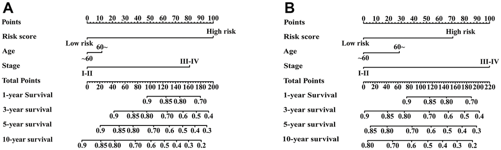 Univariate Cox regression analysis showed that age, stage and IRGPI score were significant predictors of prognosis (Supplementary Table 3). To establish a quantitative approach for RFS prediction, we performed a nomogram based on prognostic factors (IRGPI, age, and stage) in the meta-training and meta-validation sets (Figure 7A, 7B). The reliability of the nomograms was evaluated by the calibration plot. As a result, the line-segments in the calibration plots were close to the 45° line, indicating an excellent agreement between the prediction and observation in the meta-training cohort (Supplementary Figure 4A–4D) and meta-validation cohort (Supplementary Figure 4E–4H).