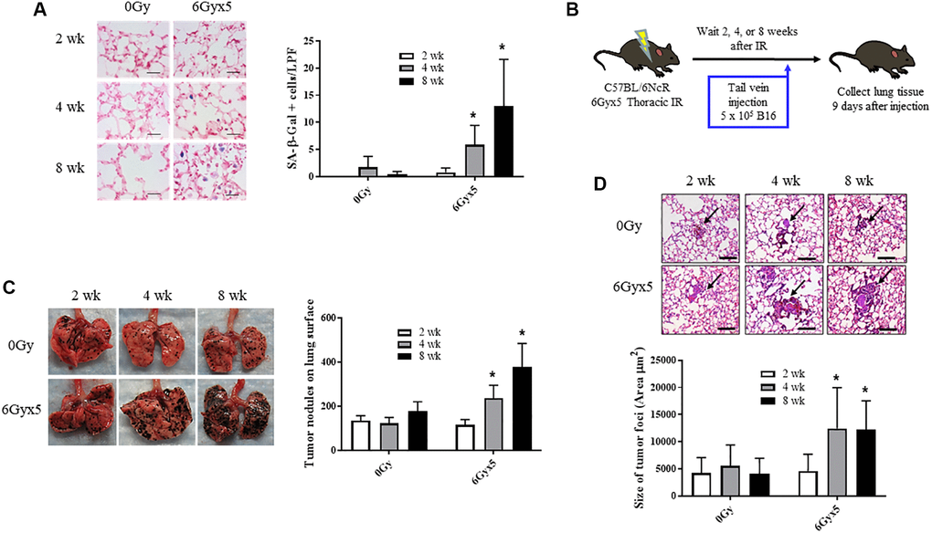 To characterize the time dependence of radiation-induced normal tissue senescence in lung, mice were exposed to 5 daily fractions of 6 Gy (6Gyx5) thoracic IR and the number of cells exhibiting SA-β-Galactosidase activity was evaluated at 2, 4, and 8 weeks after IR (n = 10 per group). This dose regimen has been extensively validated as a method to induce fibrosis and senescence in irradiated lung [3, 8, 10, 21]. As previously described, in irradiated lungs, senescent cells increased significantly 4 and 8 weeks after IR compared to age matched unirradiated controls (Figure 1A). Based on these findings, a well characterized experimental metastasis model was used to evaluate the capacity of radiated lung to support tumor growth. B16F0 melanoma cells were intravenously injected 2, 4, and 8 weeks after IR and lung colonization was scored after 9 days (n = 10 per group, Figure 1B). Significantly more B16F0 tumor nodules were observed in irradiated lungs compared to unirradiated lungs at 4 and 8 weeks after IR (Figure 1C). Similarly, the area of tumor foci was significantly larger at 4 and 8 weeks after IR compared to foci in unirradiated age matched lung (Figure 1D). Confirmatory studies in the same model using a second murine tumor cell line, Lewis lung carcinoma, provided similar results (Supplementary Figure 1). These data demonstrate a correlation between the accumulation of senescent cells and tumor growth in irradiated lung.