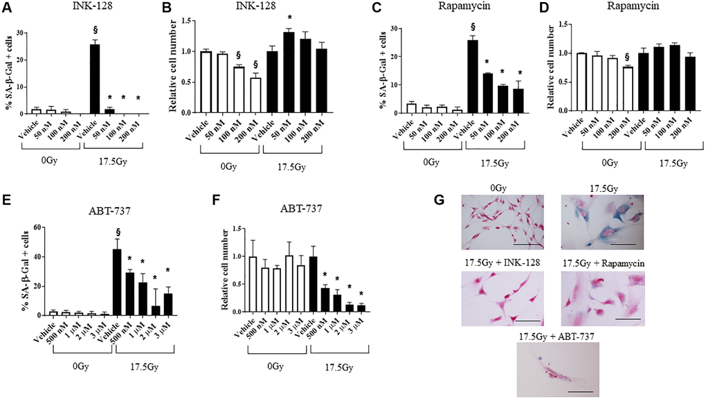 Senescent cells evade apoptosis by upregulating Bcl-xL and Bcl-w. Agents that inhibit these molecules are widely known to selectively induce apoptosis in senescent cells [32]. We confirmed the capacity of ABT-737, a BH-3 mimetic inhibitor of Bcl-2, Bcl-xL and Bcl-w [33] to selectively kill senescent murine cells in vitro. ABT-737 was delivered to NIH-3T3 cells 3 days after 17.5 Gy IR, and the percent of cells with SA-β-Galactosidase activity and relative cell numbers were assessed 2 days after drug treatment (Figure 2E–2G). ABT-737 significantly decreased the senescent cell population relative to vehicle alone at 5 days after IR with minimal toxicity in unirradiated cells. Together, these data demonstrate the senostatic function of rapamycin and INK-128, and senolytic activity of ABT-737 in murine cells.