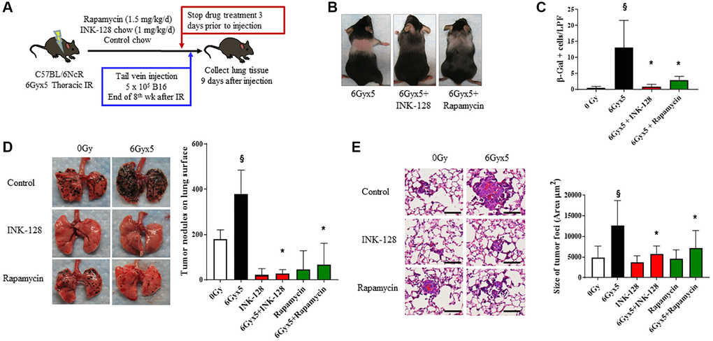 To assess whether preventing IR-induced senescence affected tumor growth, INK-128 or rapamycin treatment was initiated immediately after thoracic IR and continued for 8 weeks (Figure 3A). Mice treated with INK-128 or rapamycin demonstrated protection from IR-induced alopecia and graying seen in vehicle treated mice, an effect most pronounced with INK-128 (Figure 3B). There was no evidence of toxicity or weight loss in drug treated mice (Supplementary Figure 4A). Lung tissue from irradiated mice treated with INK- 128 or rapamycin had significantly fewer senescent cells compared to mice that were irradiated and treated with vehicle (Figure 3C).