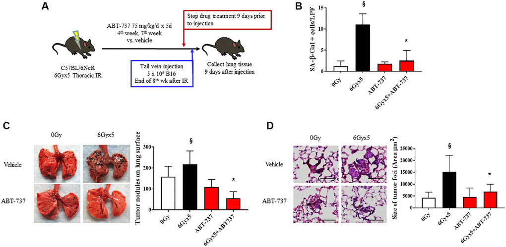 To confirm the importance of senescence in enhancing tumor growth after IR, we tested the impact of a senotherapeutic agent with a different mechanism of action in the same model. As noted in Figure 1 and prior publications [3], senescent cells accumulate in irradiated lung as early as 4 weeks after IR. To verify the senolytic activity of ABT-737 in irradiated lung, mice were treated with the senolytic agent ABT-737 in two 5-day cycles during the 4th week and 7th week after IR. There was no evidence of toxicity or weight loss in ABT-737 treated mice (Supplementary Figure 4B). Mice treated with ABT-737 demonstrated reduced pulmonary senescence and reduced radiation-induced alopecia and coat color changes compared to vehicle treated irradiated mice (Figure 4A, 4B). Based on these findings, the ABT-737 treatment regimen was combined with the experimental metastasis model in irradiated mice. ABT-737 treatment protected mice from IR-enhanced tumor colonization and growth emphasizing the important contribution of senescence in this phenomenon (Figure 4C, 4D).