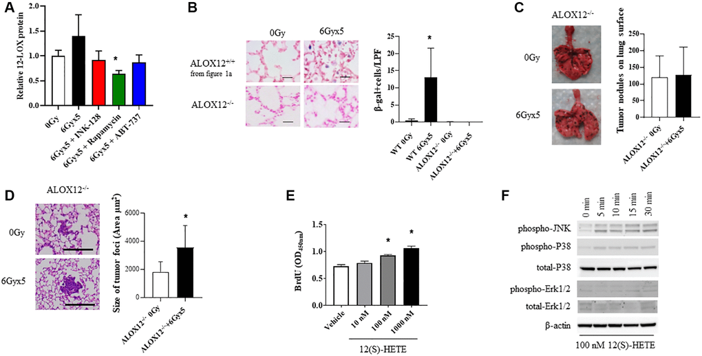 To study this phenomenon further, B16F0, LLC, and A549 proliferation was measured in the presence of 12(S)-HETE, one of the end products of 12-LOX metabolism of arachidonic acid. 12(S)-HETE increased the proliferation of tumor cells in a concentration dependent manner (Figure 5E, Supplementary Figure 7). Treatment of B16F0 cells with 12(S)-HETE activated mitogenic signaling pathways, including JNK and p38 mitogen activated kinases (MAPK) (Figure 5F). Together these findings support a role for senescence associated 12-LOX activity in IR-induced tumor growth promotion.