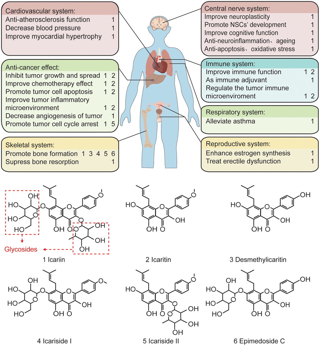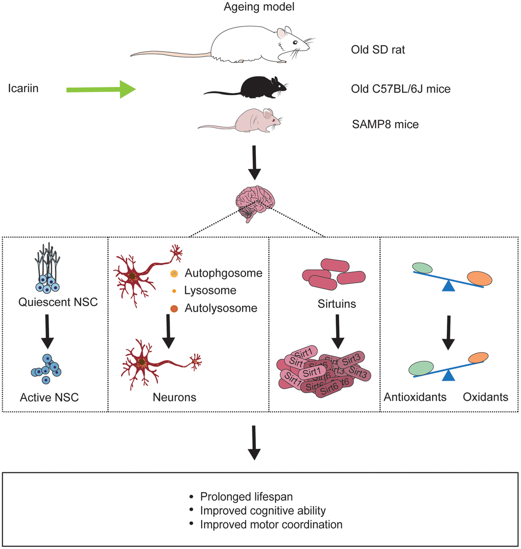 Ageing, a common physical progress with decreased regeneration, body resistance, and increased disease susceptibility [102], causes physical changes like skin pigmentation, body contraction, organ failure. Ageing has become an issue of growing concern globally, and it is crucial and necessary to find new therapeutic guidelines to fight ageing. In addition, the new approaches should not only aim to prolong the life expectancy but also keep a fit body [103]. In ancient China, many emperors sought immortality by taking elixir, but they all failed. Today, increasing evidences indicate that some herbs can delay ageing [104]. Icariin produces significant beneficial effects in both in vitro and in vivo models of ageing. It may reduce cell senescence and improve the spatial memory in SAMP8 model [105] (Figure 3).
