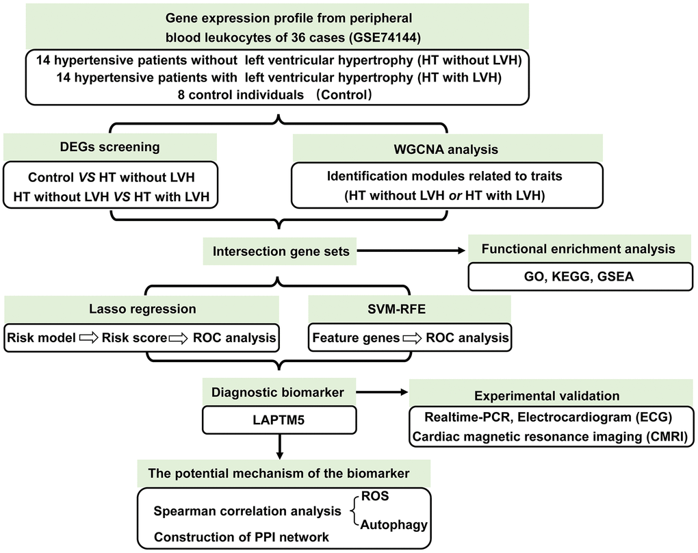 The following limitations of our study need to be noted. First, this study was a retrospective analysis of the publicly available dataset. Since other clinical information of the patients was not available, we cannot rule out that other factors might have confounded our analysis. Second, the sample size of our study was small, which might have resulted in some deviations in the results. Our results lacked validation by large and prospective clinical studies because we did not have enough blood samples with intact clinical data and without treatment to build the large-scale cohorts. Third, except for bioinformatics analysis, evidence on the molecular mechanisms of LAPTM5 in hypertensive LVH is currently lacking. Finally, as there were no other clinical parameters related to this dataset, we could not confirm that whether or not LAPTM5 is an independent predictor of HT with LVH by multivariate logistic Regression analysis. Therefore, further work should also extend our bioinformatics analyses to in vivo and in vitro experiments.