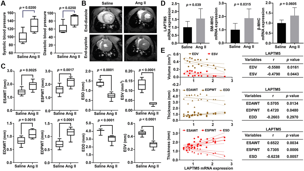 To further confirm whether LAPTM5 is a reliable diagnostic signature in HT with LVH cases, HT with LVH mouse model was developed by Ang II infusion. As shown in Figure 10A, blood pressure was markedly elevated in mice undergoing Ang II infusion for 7 days compared with the saline control groups. CMRI was used to characterize the morphological and functional changes in the left ventricle (LV) between these two groups. In LV short-axis view, Ang II-treated mouse displayed significantly increased thickness of the ventricle wall (Figure 10B), suggesting that mouse model with cardiac hypertrophy was successfully established. Further statistical analysis revealed that the end-systolic anterior wall thickness (ESAWT), end-systolic posterior wall thickness (ESPWT), end-diastolic anterior wall thickness (EDAWT), and end-diastolic posterior wall thickness (EDPWT) were obviously enhanced in the Ang II infusion group, whereas end-systolic diameter (ESD), end-systolic volume (ESV), end-diastolic diameter (EDD), and end-diastolic volume (EDV) were lower compared with the saline control group (Figure 10C). Moreover, mRNA expression of LAPTM5, smooth muscle-myosin heavy chain (SM-MHC), and β-myosin heavy chain (β-MHC) showed an upregulated tendency in leukocytes of Ang II-infused mice relative to the saline controls (Figure 10D). In contrast, there was no statistical difference for other 3 diagnostic genes EIF4A3, KLF13, NOA1 from SVM-RFE algorithm between these two groups (Supplementary Figure 4). In addition, the correlations between the abundance of LAPTM5 and cardiac structural parameters of LV were also examined to further evaluate the diagnostic accuracy and reliability. The results demonstrated that LAPTM5 had a strongly positive connection with ESAWT, ESPWT, EDAWT, and EDPWT, with correlation coefficients between 0.4720 and 0.7305. Conversely, LAPTM5 presented dramatically negative correlation with EDV, ESV, and ESD, with correlation coefficients of −0.558, −0.479, and −0.6238, respectively (Figure 10E).