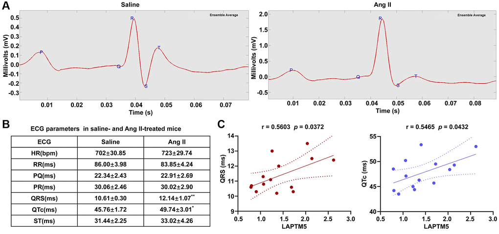 Moreover, ECG analyses were carried out between these two groups to further confirm whether cardiac remodeling had occurred in the Ang II-induced mouse model after 7 days. Compared with saline control groups, the ECG of cardiac hypertrophy in mice is characterized by a wide QRS complex and prolonged QTc interval (Figure 11B), whereas other ECG parameters remained unchanged. Figure 11A shows the representative ECG tracings. Moreover, there was a remarkable positive relation between the mRNA expression level of LAPTM5 and the QRS width, the QTc interval. Correlation coefficients were 0.5603 and 0.5465, respectively (Figure 11C). Taken together, the results confirmed that LAPTM5 could serve as the potential biomarker for hypertensive LVH. Furthermore, hypertension mouse model without cardiac hypertrophy was also developed through Ang II infusion for 1 day. Compared with the saline control group, both systolic pressure and diastolic pressure increased significantly in the Ang II-induced group, while no significant change was observed in other indices concerning left ventricular structure and function through CMRI assessment between these two groups (Supplementary Figure 5A–5C). Correspondingly, the expression abundance of LAPTM5 was also detected by RT-PCR in the hypertension mouse model without cardiac hypertrophy; however, there was no distinct change between the groups (Supplementary Figure 5D). All these findings indicate that LAPTM5 was a potential specific biomarker to designate HT with LVH.