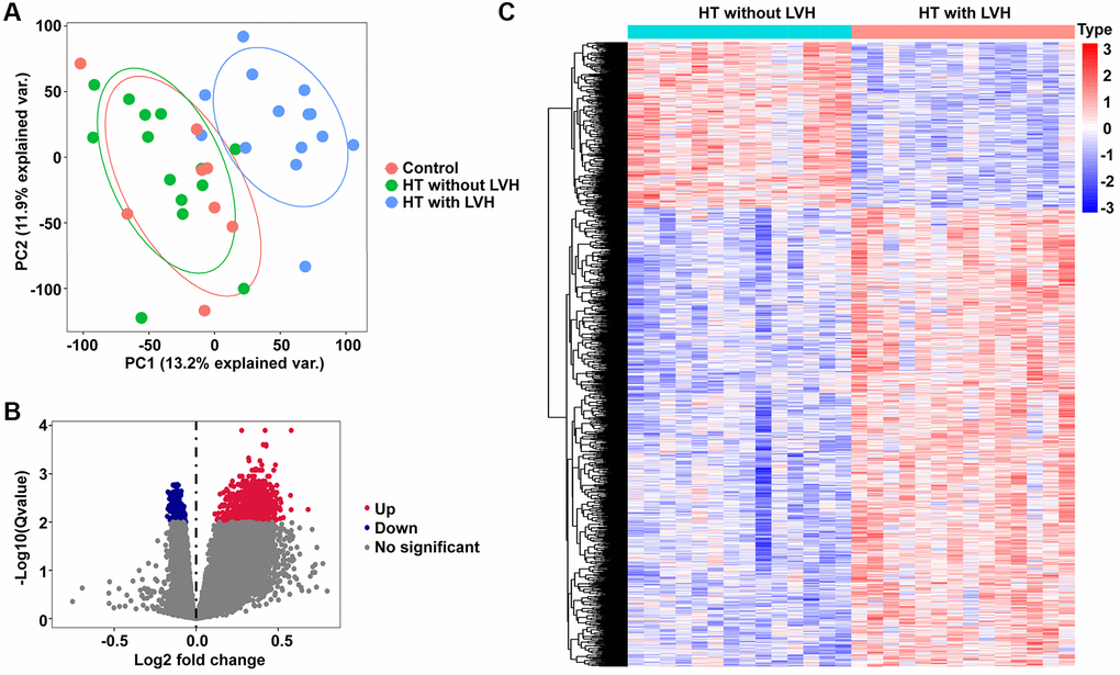 First, unsupervised principal component analysis (PCA) was applied for all samples prior to identifying the differentially expressed genes (DEGs) so as to inspect the global expression profiling in the dataset. Results of PCA showed that clusters of Control and HT without LVH significantly overlapped, while they displayed completely disjoint populations with HT with LVH (Figure 2A). Then, RNA-seq differential expression analysis was carried out. According to the screening method and criteria discussed above, no DEGs were detected between Control samples and HT without LVH samples, which was consistent with the outcome of the PCA test. In contrast, a total of 1,131 DEGs were obtained in HT with LVH compared with HT without LVH samples, of which 831 were significantly upregulated and 300 were significantly downregulated. Volcano plots were drawn to depict the DEGs of HT with LVH versus HT non-LVH, with red points indicating high expression and blue points representing low expression (Figure 2B). The landscape of DEG expression is displayed in a heat map as well (Figure 2C).