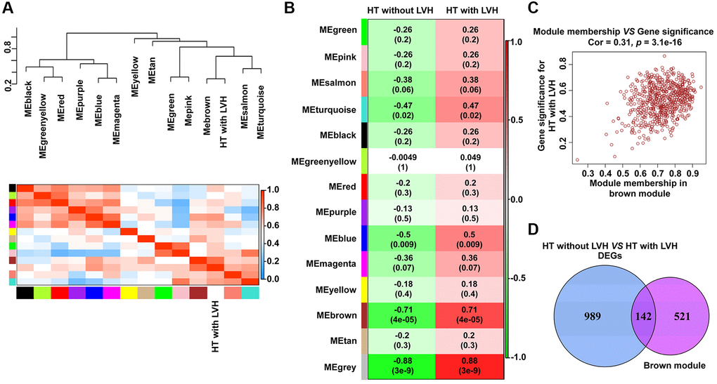 A total of 13 distinct gene co-expression modules were generated via WGCNA analysis (Supplementary Figure 1). The relevance between each module and clinical traits (HT without LVH or HT with LVH) were tested. The eigengene dendrogram and heat map indicated that the MEbrown modules highly correlated with hypertensive LVH (Figure 3A). According to the eigengene dendrogram and heatmap plot, the results demonstrated that the brown module displayed a positive relationship with HT with LVH (r = 0.71, p = 4e-05) and negative relationship with HT without LVH (r = −0.71, p = 4e-05) (Figure 3B). Gene significance and module membership were plotted for the brown module, indicating that this module was significantly related to hypertensive LVH (r = 0.31, p = 3.1e-16) (Figure 3C). Finally, 142 genes shared by brown module and DEGs derived from HT without LVH or hypertensive LVH samples were obtained to implement functional enrichment analyses (Figure 3D). Of note, all 142 genes were overexpressed in HT with LVH samples.