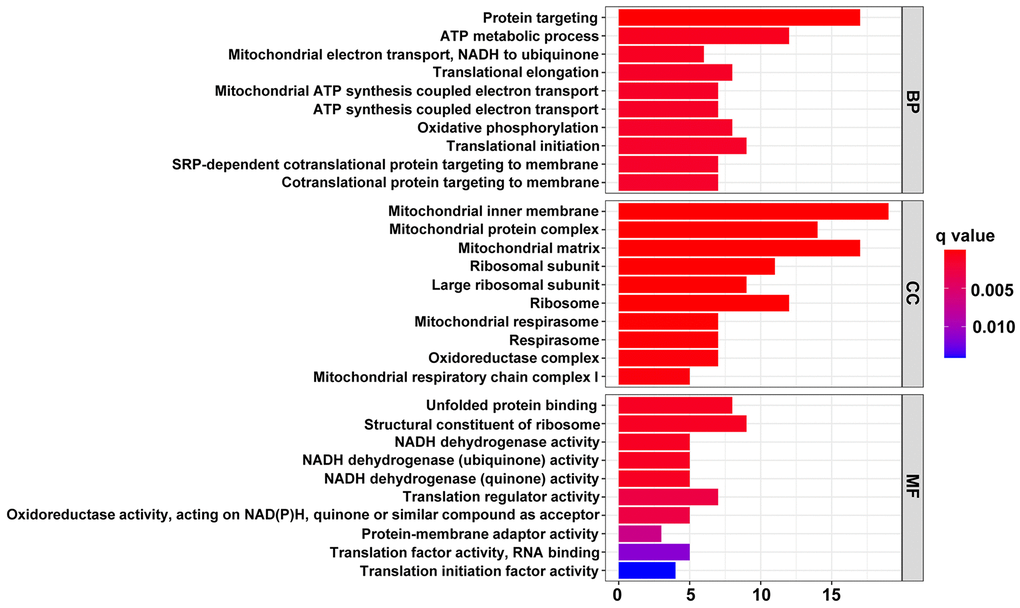 Gene Ontology (GO) and Kyoto Encyclopedia of Genes and Genomes (KEGG) functional enrichment analyses using 142 genes from the last step were conducted with R package ‘clusterProfiler’. Biological processes (BP), molecular function (MF), and cellular components (CC) were covered in the GO enrichment analysis. Only terms with an FDR adjusted p-value < 0.01 were deemed statistically enriched. The top 10 enriched terms ordered by an ascending q value are shown in the plot.