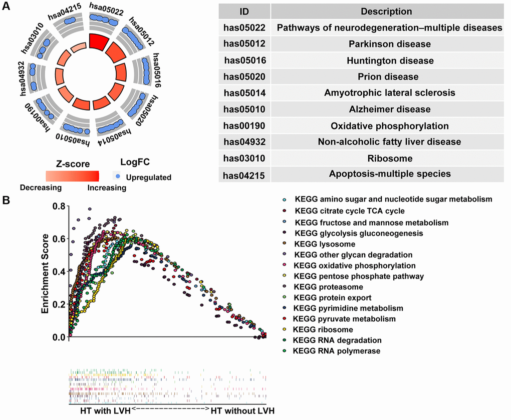 The ten most highly enriched pathways in Kyoto Encyclopedia of Genes and Genomes (KEGG) were related to three aspects: (I) mitochondrial abnormalities leading to neuronal degenerative diseases, including Alzheimer's disease (AD), Parkinson's disease (PD), Huntington's disease (HD), amyotrophic lateral sclerosis (ALS), and prion disease; (II) cell apoptosis, like apoptosis-multiple species; (III) other diseases or pathways resulting from dysfunctional mitochondria, such as nonalcoholic fatty liver and oxidative phosphorylation, respectively (Figure 5A). Simultaneously, gene set enrichment analysis (GSEA) was also conducted to uncover the enriched hallmarks and pathways in hypertensive patients with LVH. The results showed that enriched pathways mainly focused on lysosome, proteasome, ribosome, RNA polymerase and degradation, as well as multiple pathways in nutrient metabolism (Figure 5B). Taken together, these results implied that mitochondrial dysfunction in peripheral blood leukocytes might be a potential indicator of HT with LVH.