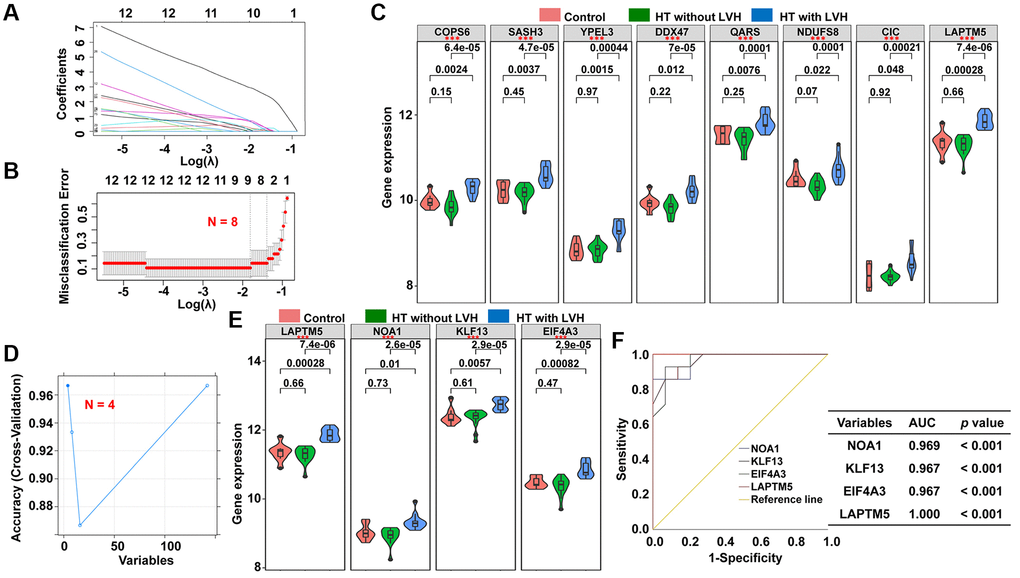 Least absolute shrinkage and selection operator (LASSO) regression was employed to construct a multi-molecule panel signature with 142 genes to discriminate HT without LVH from HT with LVH using ‘glmnet’ package of R software. To acquire more reliable and objective results, five-fold cross-validation was used to identify the optimal lambda value with the minimum misclassification error. Then, the risk score for each subject was obtained using the risk assessment model. Simultaneously, area under the receiver operating characteristic (ROC) curve was utilized to evaluate the diagnostic sensitivity and specificity of the subset genes and risk score, using SPSS25.0 (IBM Corp., Armonk, New York, USA).