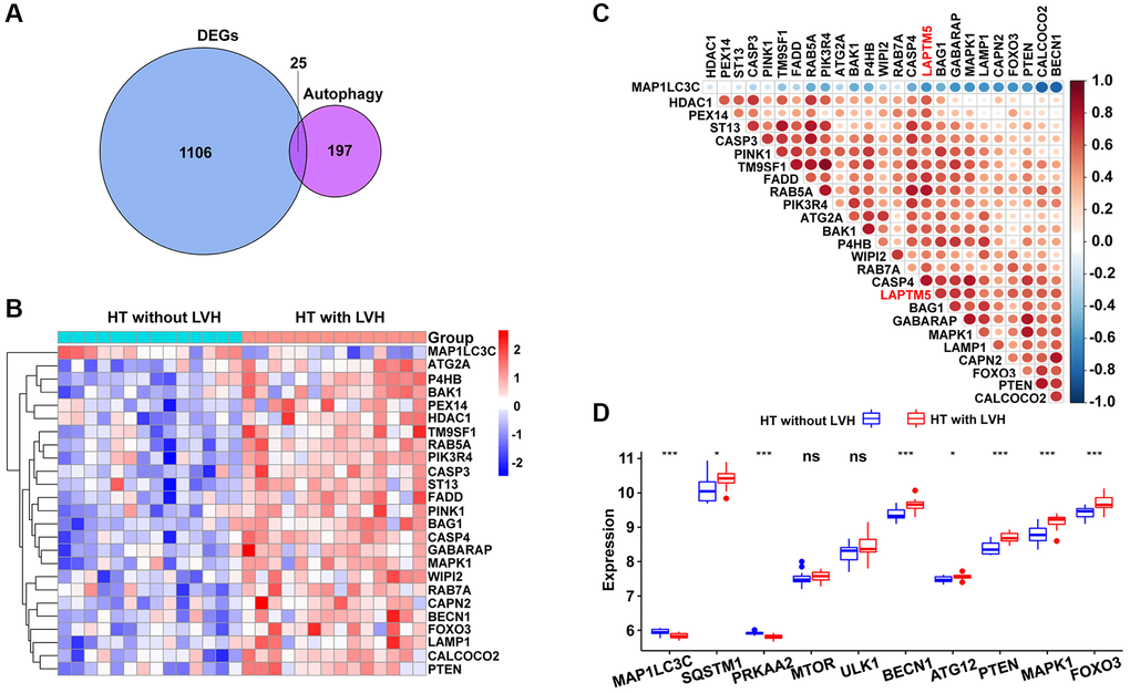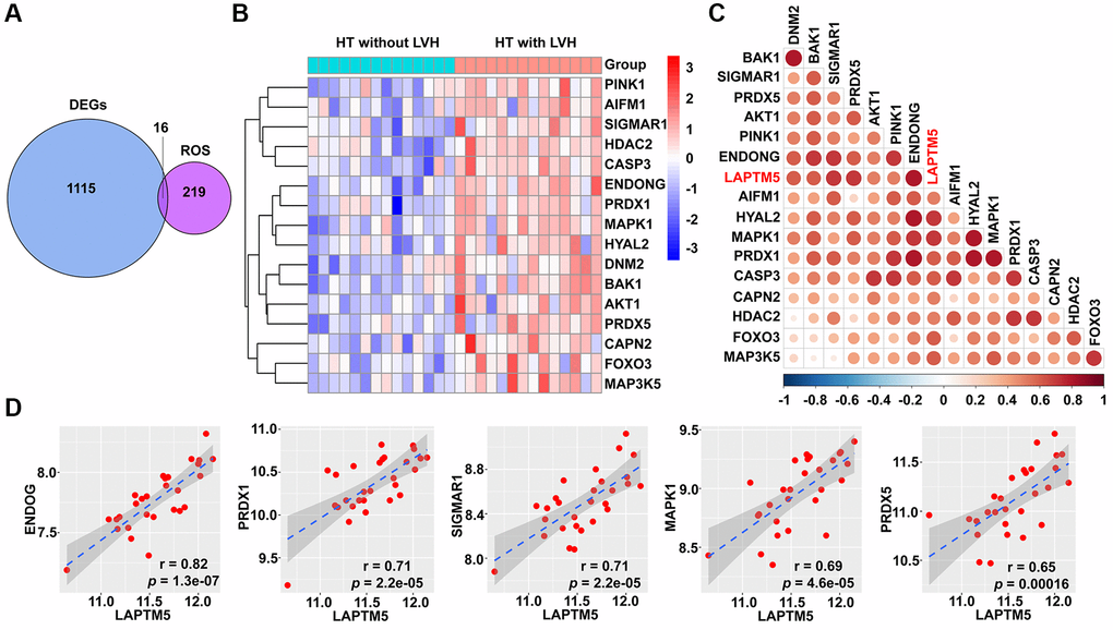 The relationships between the mRNA expression of the potential diagnostic biomarker and reactive oxygen species (ROS) or autophagy-related genes were investigated using Spearman’s correlation coefficient. mRNA gene sets of ROS (n = 285) originated from biological processes (BP) annotated with ‘response to oxidative stress’, the subset of Gene Ontology (GO) downloaded from GSEA (https://www.gsea-msigdb.org/gsea/index.jsp). Autophagy-related genes were derived from the Human Autophagy Database (HADb, http://www.autophagy.lu/), which provided a complete and an up-to-date list of human genes and proteins involved directly or indirectly in autophagy as described in literature. The specific procedures for Spearman’s correlation analysis were as follows: DEGs and ROS or autophagy-related genes were intersected to obtain differentially expressed ROS or autophagy-related genes. Then, the heat maps of Spearman’s correlation coefficients and scatterplots between the expression level of lysosomal associated transmembrane protein 5 (LAPTM5), and ROS or autophagy-related molecules were plotted to clarify the underlying molecular mechanism leading to left ventricular remodeling in hypertensive patients.