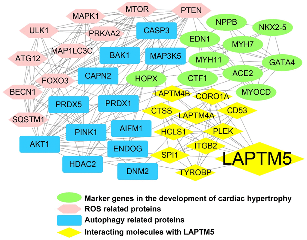 To further elucidate the role of LAPTM5 in hypertensive LVH, the PPI network was constructed. Depending on the source of the proteins mentioned in the methods, the regulatory network consisted of four modules with different colors, including 37 nodes and 150 edges (Figure 9). Thirteen genes, including AKT serine/threonine kinase 1 (AKT1), caspase 3 (CASP3), PTEN, BECN1, FOXO3, MTOR, pleckstrin (PLEK), ATG12, PTEN induced kinase 1 (PINK1), MAPK1, LAPTM5, ULK1, and SQSTM1, were identified with connection degree over 10. As expected, the network demonstrated that LAPTM5 could crosstalk with the other three modules, which possibly indirectly leads to LVH through oxidative stress and cellular autophagy.