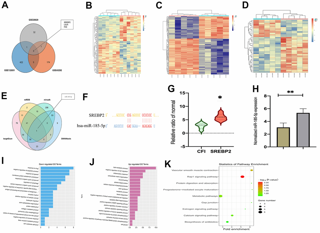 To identify the mRNAs that may contribute to the atherosclerosis progression, the gene expression profiles in GSE43292, GSE132651, and GSE28829 datasets were obtained from the GEO database comprised of atherosclerosis samples, and samples with insufficient clinical data were ignored. The top 100 DEGs in these datasets were obtained. Then Venn diagram analysis was carried out to visualize the overlapping DEGs among these datasets, including SREBP2, LDLR, and Fas (Figure 1A). A heat map depicting the top 50 DEGs from GSE132651 dataset was shown in Figure 1B. A heat map depicting the DEGs from GSE43292 dataset was displayed in Figure 1C. A heat map depicting the DEGs from GSE28829 dataset was exhibited in Figure 1D. Next, the assumed miRNAs targeting SREBP2 were determined by TargetScan, miRDB, miRWalk, and DIANA tools. By evaluating the top 50 miRNAs from each prediction website, miR-185-5p was identified as the common predictive miRNA. Besides, SREBP2 and miRNA were predicted respectively, and Wayne diagram was used to obtain the intersection (Figure 1E). In particular, it was found through comparing the prediction results that miR-185-5p had targeted binding regions with SREBP2 (Figure 1F). SREBP2 was identified as a highly expressed gene in atherosclerosis according to the data from GSE132651 dataset (Figure 1G), suggesting that SREBP2 may affect the development of atherosclerosis. The miR-185-5p levels were tested by Q-PCR in atherosclerotic plaques and surrounding tissue, and the miR-185-5p levels were much lower in AS plaques (Figure 1H). To further explain gene expression alterations in atherosclerosis, functional classification of DEGs was performed by means of the Gene Ontology (GO) annotations and Kyoto Encyclopedia of Genes and Genomes (KEGG) pathway analysis. According to the data from GSE132651 dataset, the enrichment processes of GO annotations were depicted in Figure 1I, 1J. It was manifested that the DEGs were mainly enriched in the lipid metabolic process, inflammatory response, and metabolic process. All differential genes discovered via KEGG pathway analysis were depicted in Figure 1K. The above results implied that the effects of miR-185-5p and its target gene SREBP2 on atherosclerosis may be realized via the lipid metabolic signaling pathway.