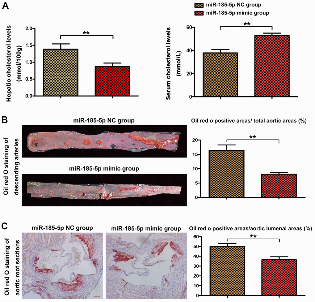 MiR-185-5p mimic increased serum but decreased hepatic cholesterol levels and suppressed atherosclerosis in HFD-fed apoE-/- mice
